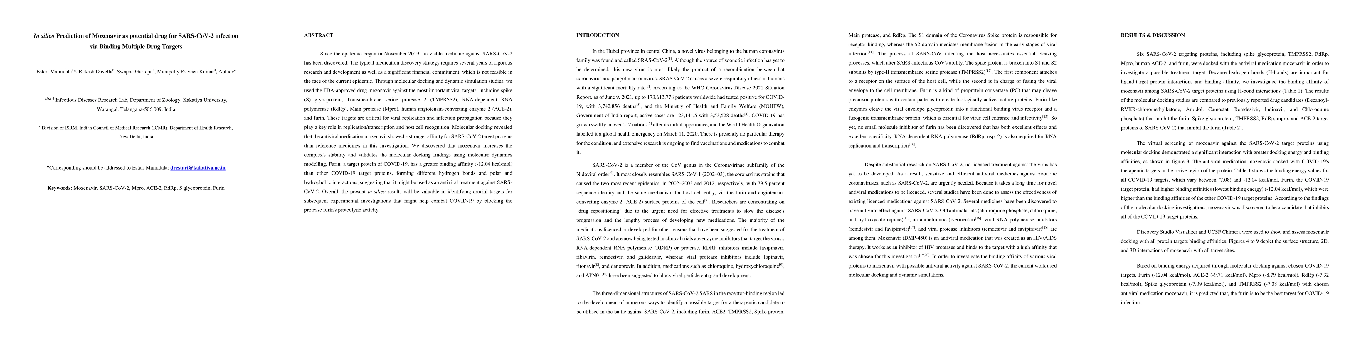 Since the epidemic began in November 2019, no viable medicine against SARS-CoV-2 has been discovered. The typical medication discovery strategy requires several years of rigorous research and development as well as a significant financial commitment, which is not feasible in the face of the current epidemic. Through molecular docking and dynamic simulation studies, we used the FDA-approved drug mezonavir against the most important viral targets, including spike (S) glycoprotein, Transmembrane serine protease 2 (TMPRSS2), RNA-dependent RNA polymerase (RdRp), Main protease (Mpro), human angiotensin-converting enzyme 2 (ACE-2), and furin. These targets are critical for viral replication and infection propagation because they play a key role in replication/transcription and host cell recognition. Molecular docking revealed that the antiviral medication mozenavir showed a stronger affinity for SARS-CoV-2 target proteins than reference medicines in this investigation. We discovered that mozenavir increases the complex's stability and validates the molecular docking findings using molecular dynamics modelling. Furin, a target protein of COVID-19, has a greater binding affinity (-12.04 kcal/mol) than other COVID-19 target proteins, forming different hydrogen bonds and polar and hydrophobic interactions, suggesting that it might be used as an antiviral treatment against SARS-CoV-2. Overall, the present in silico results will be valuable in identifying crucial targets for subsequent experimental investigations that might help combat COVID-19 by blocking the protease furin's proteolytic activity.