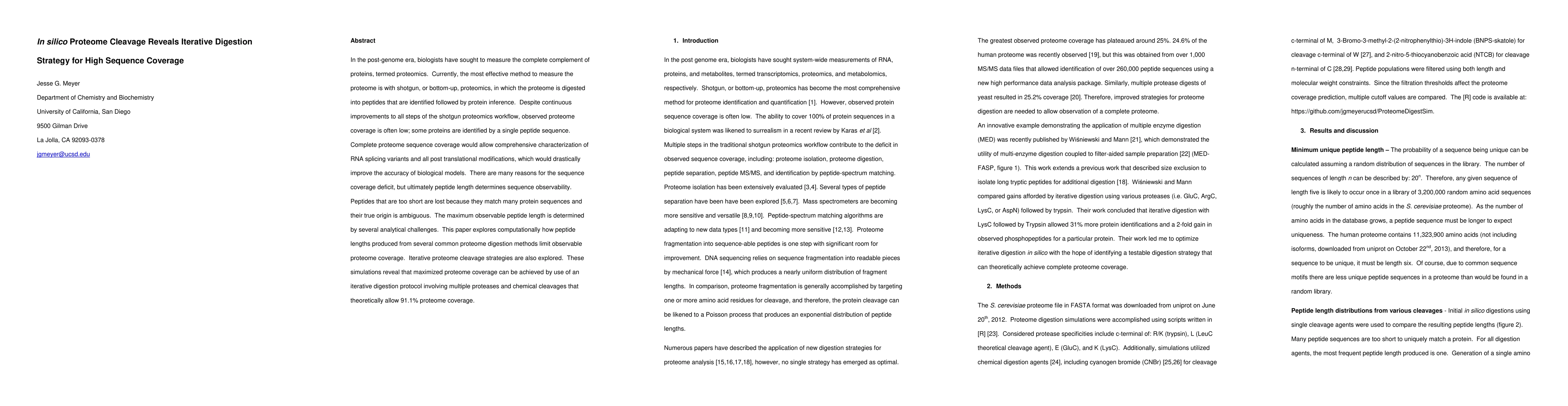 In the post-genome era, biologists have sought to measure the complete complement of proteins, termed proteomics. Currently, the most effective method to measure the proteome is with shotgun, or bottom-up, proteomics, in which the proteome is digested into peptides that are identified followed by protein inference. Despite continuous improvements to all steps of the shotgun proteomics workflow, observed proteome coverage is often low; some proteins are identified by a single peptide sequence. Complete proteome sequence coverage would allow comprehensive characterization of RNA splicing variants and all post translational modifications, which would drastically improve the accuracy of biological models. There are many reasons for the sequence coverage deficit, but ultimately peptide length determines sequence observability. Peptides that are too short are lost because they match many protein sequences and their true origin is ambiguous. The maximum observable peptide length is determined by several analytical challenges. This paper explores computationally how peptide lengths produced from several common proteome digestion methods limit observable proteome coverage. Iterative proteome cleavage strategies are also explored. These simulations reveal that maximized proteome coverage can be achieved by use of an iterative digestion protocol involving multiple proteases and chemical cleavages that theoretically allow 91.1% proteome coverage.