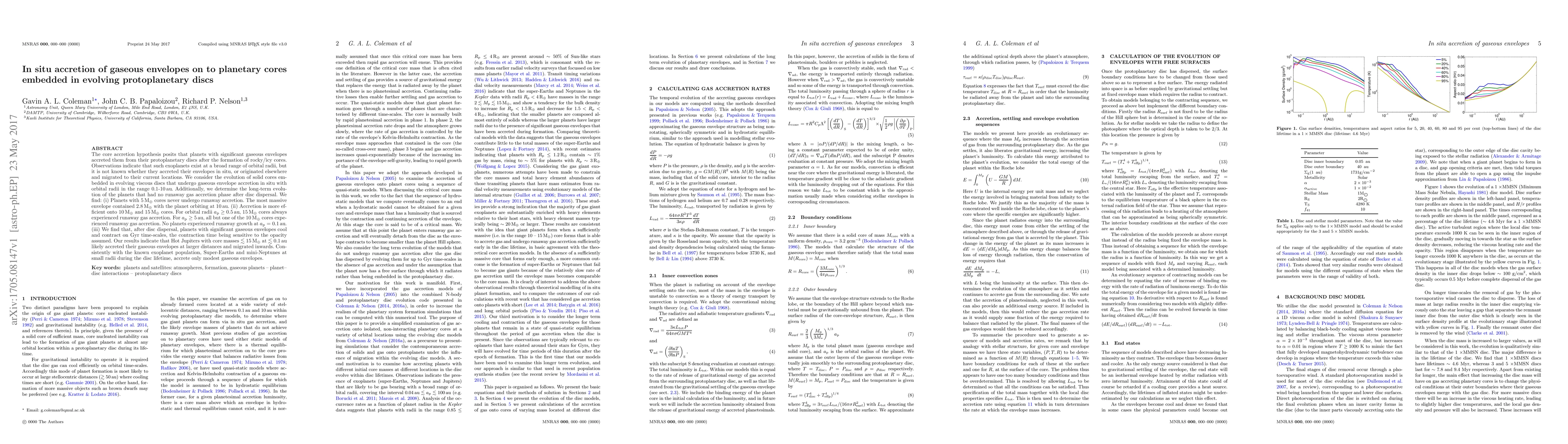 The core accretion hypothesis posits that planets with significant gaseous envelopes accreted them from their protoplanetary discs after the formation of rocky/icy cores. Observations indicate that such exoplanets exist at a broad range of orbital radii, but it is not known whether they accreted their envelopes in situ, or originated elsewhere and migrated to their current locations. We consider the evolution of solid cores embedded in evolving viscous discs that undergo gaseous envelope accretion in situ with orbital radii in the range $0.1-10\rm au$. Additionally, we determine the long-term evolution of the planets that had no runaway gas accretion phase after disc dispersal. We find: (i) Planets with $5 \rm M_{\oplus}$ cores never undergo runaway accretion. The most massive envelope contained $2.8 \rm M_{\oplus}$ with the planet orbiting at $10 \rm au$. (ii) Accretion is more efficient onto $10 \rm M_{\oplus}$ and $15 \rm M_{\oplus}$ cores. For orbital radii $a_{\rm p} \ge 0.5 \rm au$, $15 \rm M_{\oplus}$ cores always experienced runaway gas accretion. For $a_{\rm p} \ge 5 \rm au$, all but one of the $10 \rm M_{\oplus}$ cores experienced runaway gas accretion. No planets experienced runaway growth at $a_{\rm p} = 0.1 \rm au$. (iii) We find that, after disc dispersal, planets with significant gaseous envelopes cool and contract on Gyr time-scales, the contraction time being sensitive to the opacity assumed. Our results indicate that Hot Jupiters with core masses $\lesssim 15 \rm M_{\oplus}$ at $\lesssim 0.1 \rm au$ likely accreted their gaseous envelopes at larger distances and migrated inwards. Consistently with the known exoplanet population, Super-Earths and mini-Neptunes at small radii during the disc lifetime, accrete only modest gaseous envelopes.