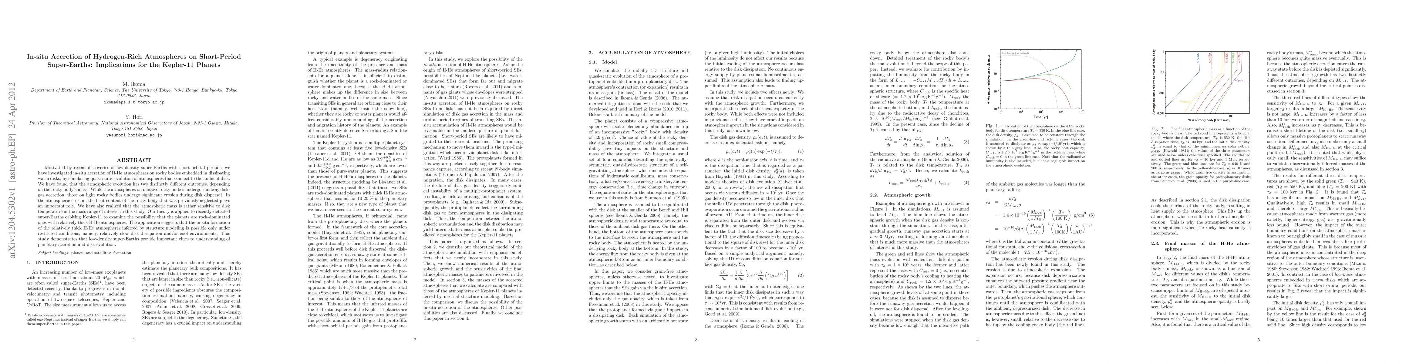 This research investigates the in-situ accretion of hydrogen-rich atmospheres on short-period super-Earths, finding that atmospheric evolution depends on the rocky body's mass, with significant erosion in light bodies. The study applies this theory to the Kepler-11 planets, suggesting that thick H-He atmospheres require slow disk dissipation or cool environments.
