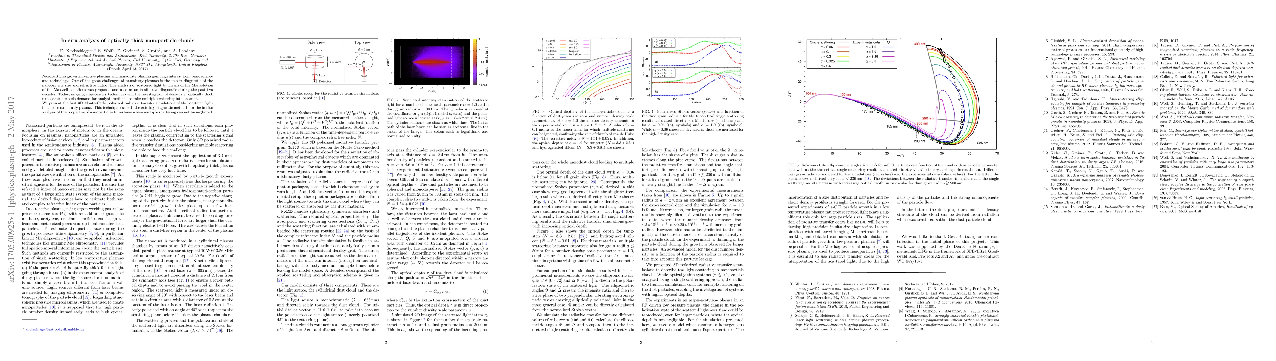 Nanoparticles grown in reactive plasmas and nanodusty plasmas gain high interest from basic science and technology. One of the great challenges of nanodusty plasmas is the in-situ diagnostic of the nanoparticle size and refractive index. The analysis of scattered light by means of the Mie solution of the Maxwell equations was proposed and used as an in-situ size diagnostic during the past two decades. Today, imaging ellipsometry techniques and the investigation of dense, i. e. optically thick nanoparticle clouds demand for analysis methods to take multiple scattering into account. We present the first 3D Monte-Carlo polarized radiative transfer simulations of the scattered light in a dense nanodusty plasma. This technique extends the existing diagnostic methods for the in-situ analysis of the properties of nanoparticles to systems where multiple scattering can not be neglected.