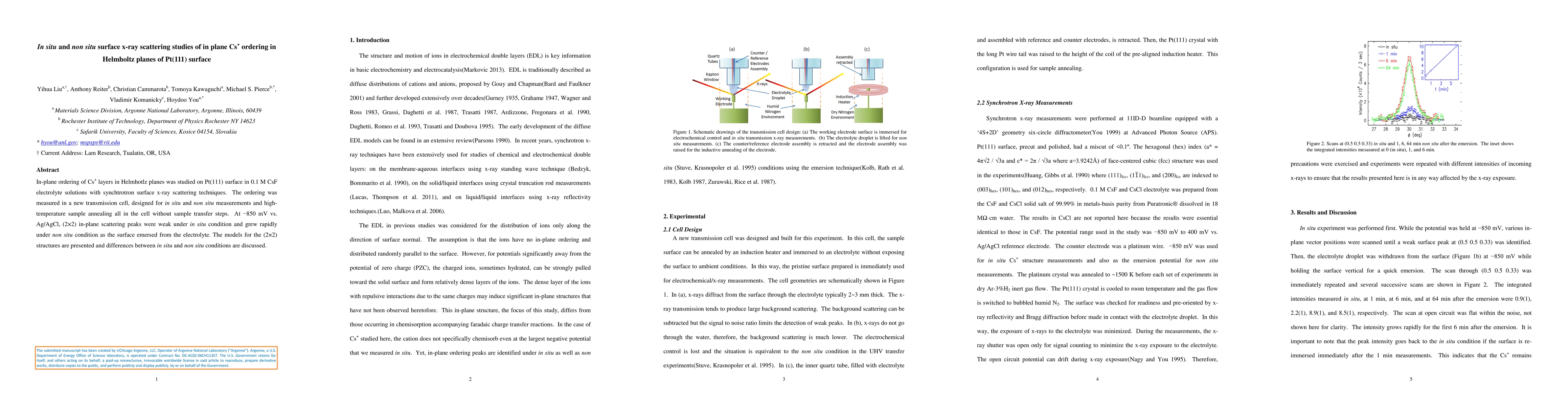 In-plane ordering of Cs+ layers in Helmhotlz planes was studied on Pt(111) surface in 0.1 M CsF electrolyte solutions with synchtrotron surface x-ray scattering techniques. The ordering was measured in a new transmission cell, designed for in situ and non situ measurements and high-temperature sample annealing all in the cell without sample transfer steps. At -850 mV vs. Ag/AgCl, (2x2) in-plane scattering peaks were weak under in situ condition and grew rapidly under non situ condition as the surface emersed from the electrolyte. The models for the (2x2) structures are presented and differences between in situ and non situ conditions are discussed.