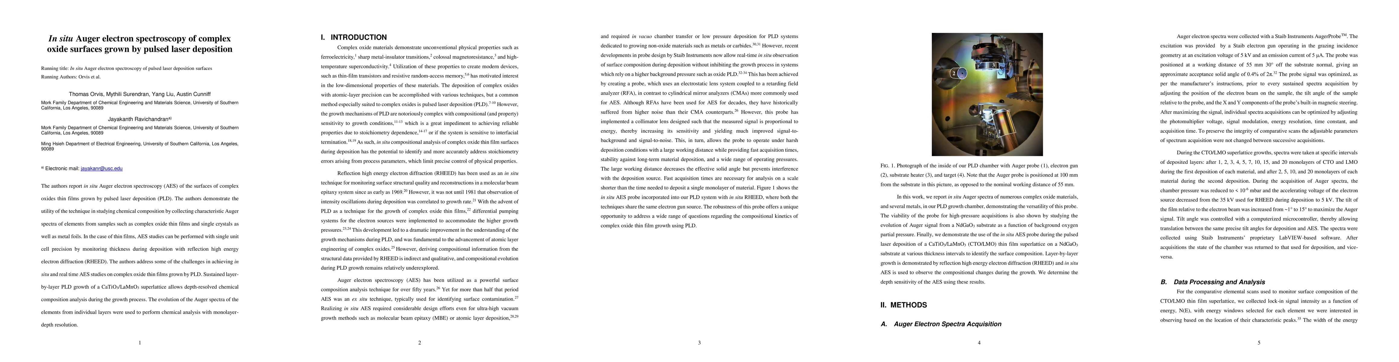 This paper utilizes in situ Auger electron spectroscopy (AES) to study chemical composition in complex oxide thin films grown by pulsed laser deposition (PLD), demonstrating the technique's precision in analyzing elements with monolayer-depth resolution. The study highlights the challenges and benefits of real-time AES during PLD, exemplified by the growth of a CaTiO3/LaMnO3 superlattice.