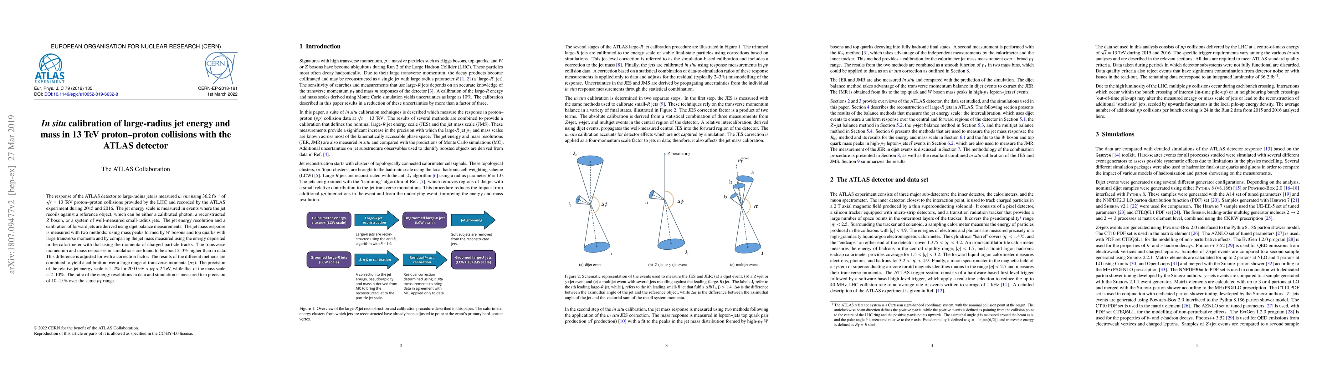 The response of the ATLAS detector to large-radius jets is measured in situ using 36.2 fb$^{-1}$ of $\sqrt{s} = 13$ TeV proton-proton collisions provided by the LHC and recorded by the ATLAS experiment during 2015 and 2016. The jet energy scale is measured in events where the jet recoils against a reference object, which can be either a calibrated photon, a reconstructed $Z$ boson, or a system of well-measured small-radius jets. The jet energy resolution and a calibration of forward jets are derived using dijet balance measurements. The jet mass response is measured with two methods: using mass peaks formed by $W$ bosons and top quarks with large transverse momenta and by comparing the jet mass measured using the energy deposited in the calorimeter with that using the momenta of charged-particle tracks. The transverse momentum and mass responses in simulations are found to be about 2-3% higher than in data. This difference is adjusted for with a correction factor. The results of the different methods are combined to yield a calibration over a large range of transverse momenta ($p_{\rm T}$). The precision of the relative jet energy scale is 1-2% for $200~{\rm GeV} < p_{\rm T} < 2~{\rm TeV}$, while that of the mass scale is 2-10%. The ratio of the energy resolutions in data and simulation is measured to a precision of 10-15% over the same $p_{\rm T}$ range.