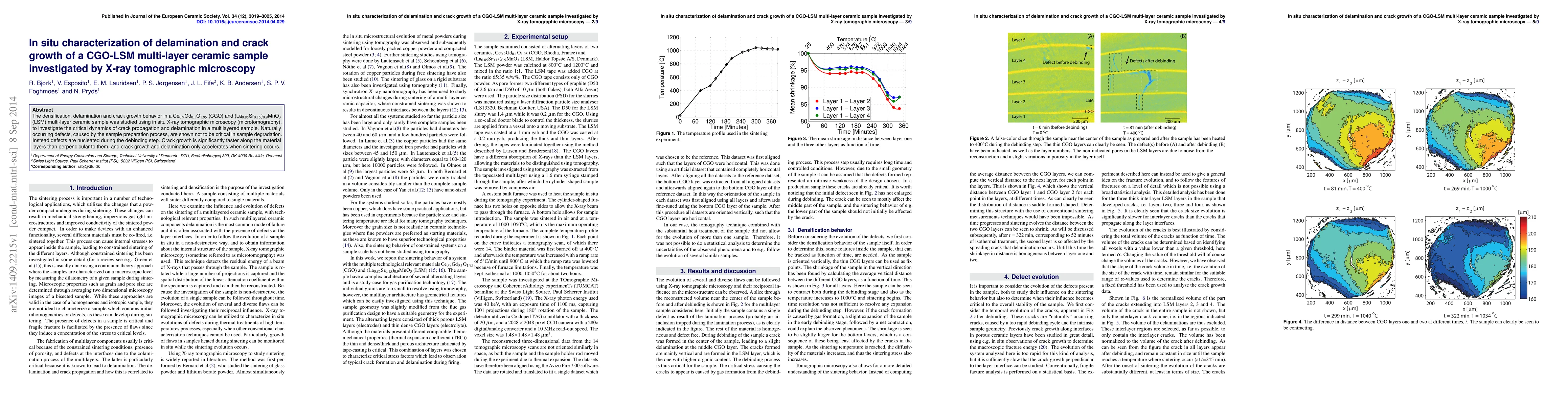 This study uses in situ X-ray tomographic microscopy to investigate the crack propagation and delamination in a CGO-LSM multi-layer ceramic sample, finding that naturally occurring defects from sample preparation are not critical, but defects nucleated during debinding are. Crack growth is faster along the layers than perpendicular to them, and accelerates with sintering.