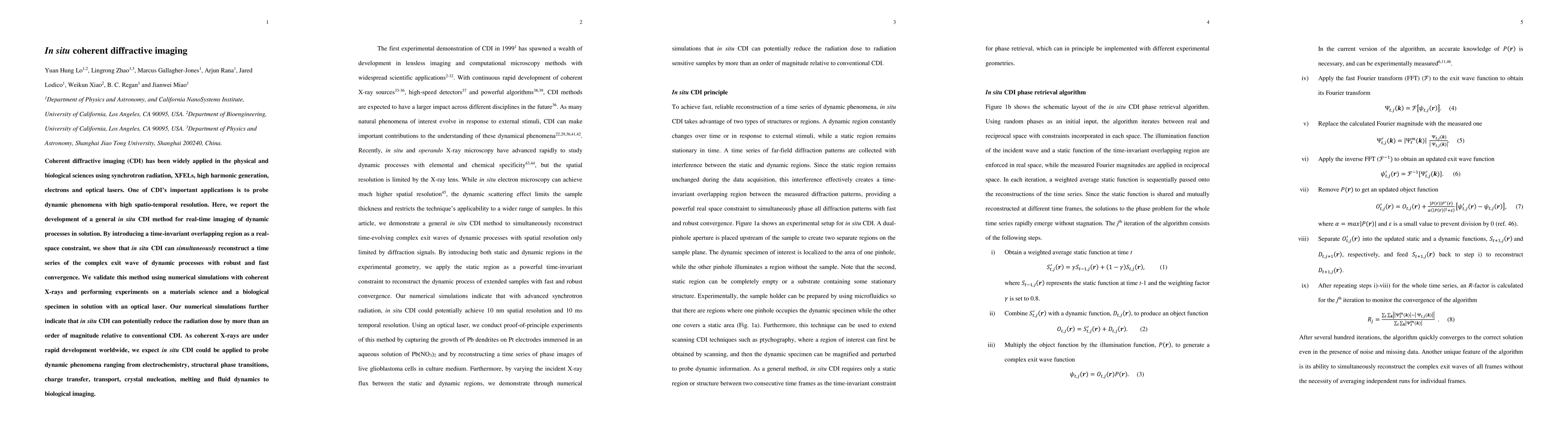 This paper introduces an in situ coherent diffractive imaging (CDI) method for real-time imaging of dynamic processes in solution, achieving robust and fast convergence through a time-invariant overlapping region. The method is validated with simulations and experiments, showing potential for significantly reduced radiation dose compared to conventional CDI.
