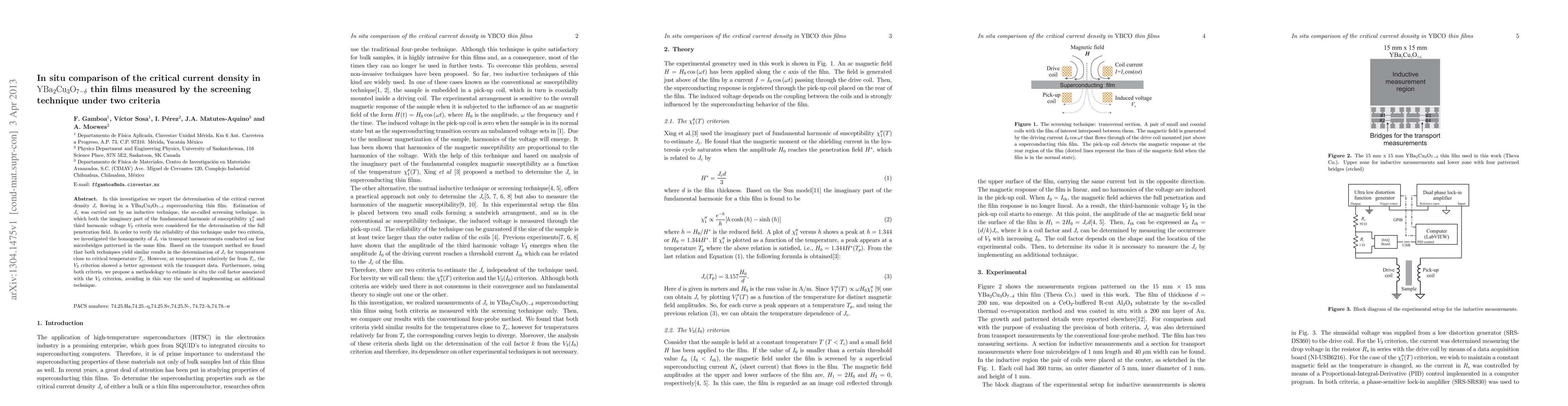 In this investigation we report the determination of the critical current density $J_c$ flowing in a $\mathrm{Y}\mathrm{Ba}_2\mathrm{Cu}_3\mathrm{O}_{7-\delta}$ superconducting thin film. Estimation of $J_c$ was carried out by an inductive technique, the so-called screening technique, in which both the imaginary part of the fundamental harmonic of susceptibility $\chi''_1$ and third harmonic voltage $V_3$ criteria were considered for the determination of the full penetration field. In order to verify the reliability of this technique under two criteria, we investigated the homogeneity of $J_c$ via transport measurements conducted on four microbridges patterned in the same film. Based on the transport method we found that both techniques yield similar results in the determination of $J_c$ for temperatures close to critical temperature $T_c$. However, at temperatures relatively far from $T_c$, the $V_3$ criterion showed a better agreement with the transport data. Furthermore, using both criteria, we propose a methodology to estimate in situ the coil factor associated with the $V_3$ criterion, avoiding in this way the need of implementing an additional technique.