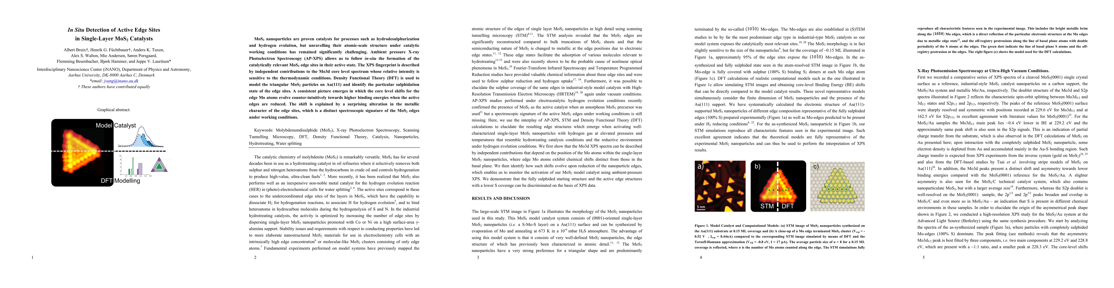This paper utilizes Ambient Pressure X-ray Photoelectron Spectroscopy (AP-XPS) to detect active edge sites in single-layer MoS$_2$ catalysts in situ, revealing a counter-intuitive shift in binding energies towards higher values during reduction, attributed to a change in the metallic character of the edge sites. Density Functional Theory (DFT) modeling supports these findings, providing a detailed atomic-scale understanding of the catalytic process.