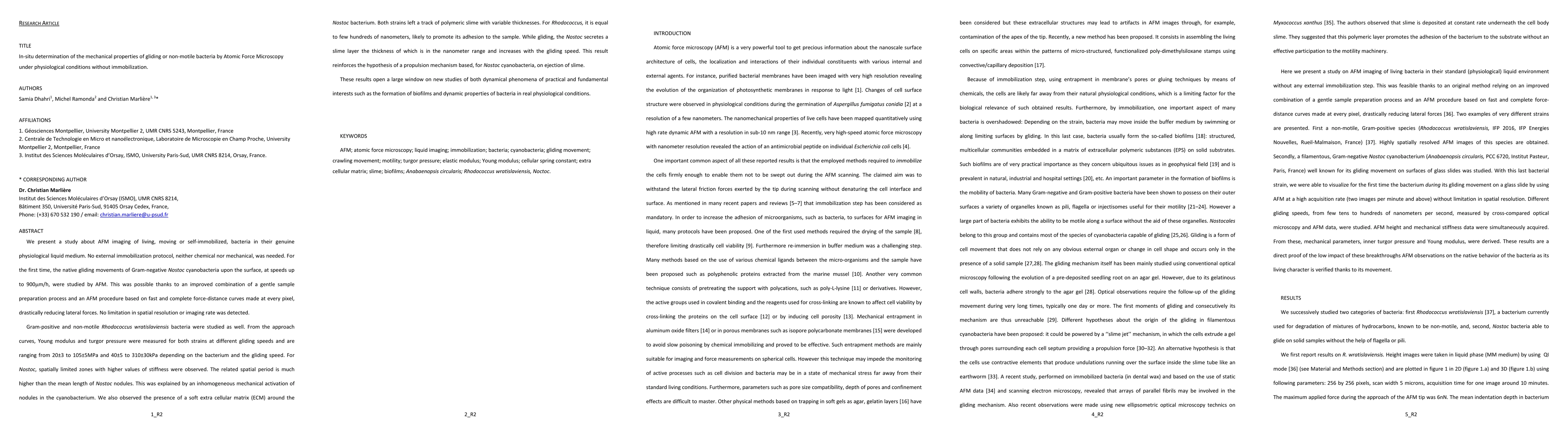 We present a study about AFM imaging of living, moving or self-immobilized, bacteria in their genuine physiological liquid medium. No external immobilization protocol, neither chemical nor mechanical, was needed. For the first time, the native gliding movements of Gram-negative Nostoc cyanobacteria upon the surface, at speeds up to 900microns/h, were studied by AFM. This was possible thanks to an improved combination of a gentle sample preparation process and an AFM procedure based on fast and complete force-distance curves made at every pixel, drastically reducing lateral forces. No limitation in spatial resolution or imaging rate was detected. Gram-positive and non-motile Rhodococcus wratislaviensis bacteria were studied as well. From the approach curves, Young modulus and turgor pressure were measured for both strains at different gliding speeds and are ranging from 20 to 105MPa and 40 to 310kPa depending on the bacterium and the gliding speed. For Nostoc, spatially limited zones with higher values of stiffness were observed. The related spatial period is much higher than the mean length of Nostoc nodules. This was explained by an inhomogeneous mechanical activation of nodules in the Nostoc. We also observed the presence of a soft extra cellular matrix (ECM) around the Nostoc bacterium. Both strains left a track of polymeric slime with variable thicknesses. For Rhodococcus, it is equal to few hundreds of nm, likely to promote its adhesion to the sample. While gliding, the Nostoc secretes a slime layer the thickness of which is in the nanometer range and increases with the gliding speed. These results open a large window on new studies of both dynamical phenomena of practical and fundamental interests such as the formation of biofilms and dynamic properties of bacteria in real physiological conditions.
