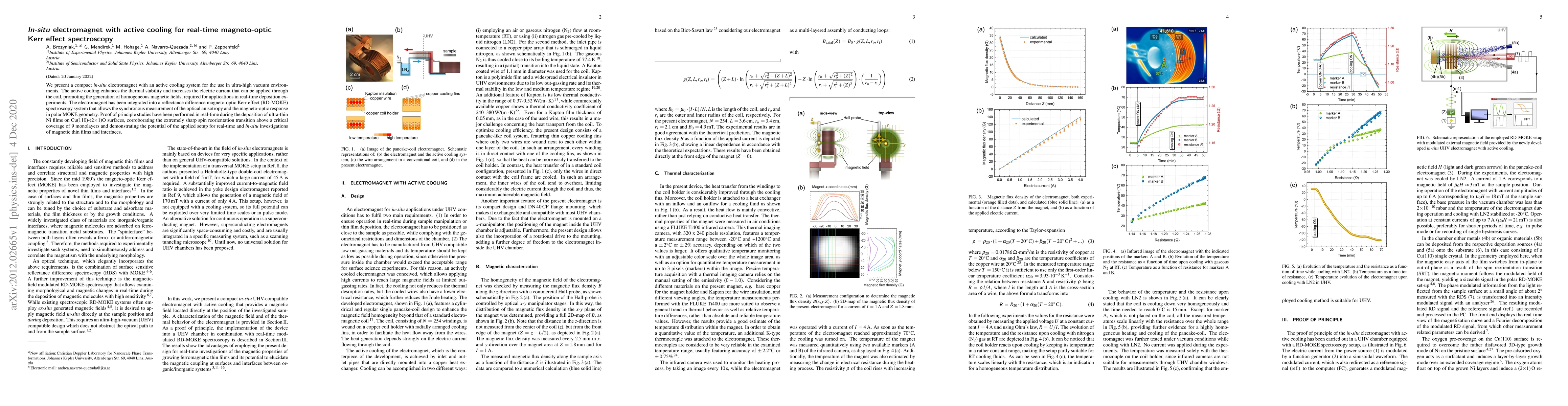 This paper introduces a compact in-situ electromagnet with active cooling for ultra-high vacuum environments, enhancing thermal stability and enabling higher current for homogeneous magnetic fields. The setup integrates with RD-MOKE spectroscopy, successfully demonstrating real-time investigations of magnetic thin films during deposition.