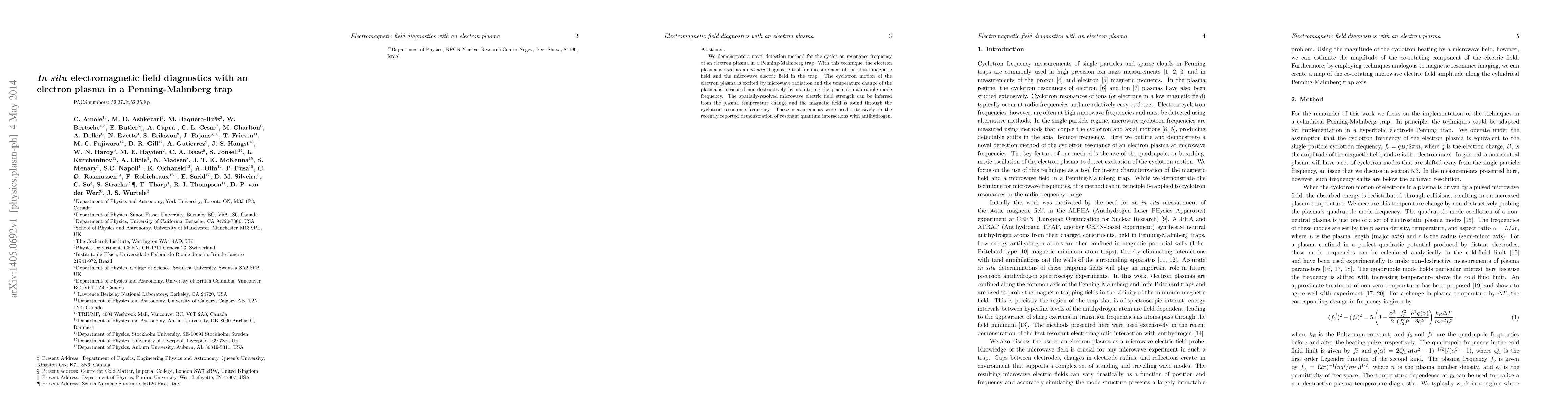 We demonstrate a novel detection method for the cyclotron resonance frequency of an electron plasma in a Penning-Malmberg trap. With this technique, the electron plasma is used as an in situ diagnostic tool for measurement of the static magnetic field and the microwave electric field in the trap. The cyclotron motion of the electron plasma is excited by microwave radiation and the temperature change of the plasma is measured non-destructively by monitoring the plasma's quadrupole mode frequency. The spatially-resolved microwave electric field strength can be inferred from the plasma temperature change and the magnetic field is found through the cyclotron resonance frequency. These measurements were used extensively in the recently reported demonstration of resonant quantum interactions with antihydrogen.