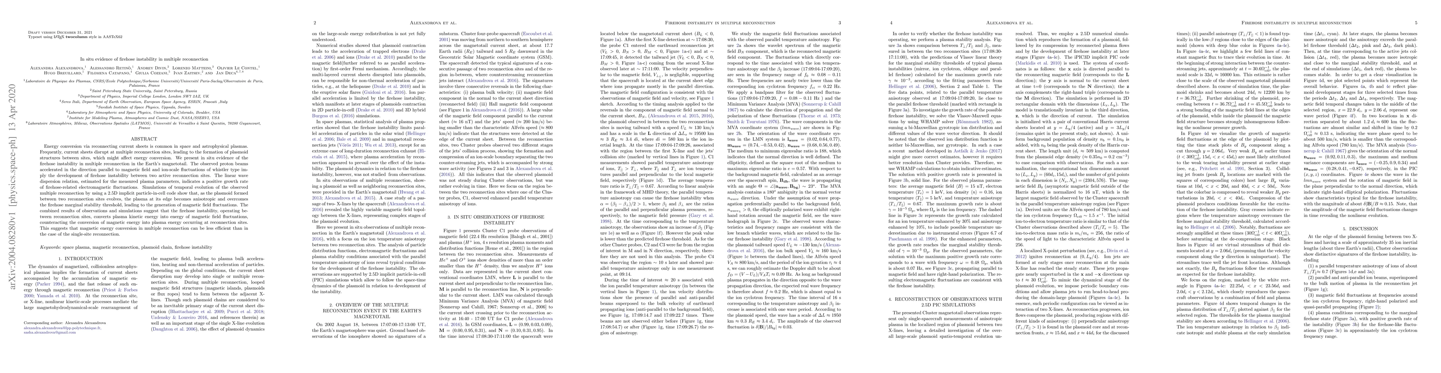 This paper presents in situ evidence of the firehose instability in multiple reconnection in the Earth's magnetotail, showing that proton beams and whistler-type fluctuations lead to magnetic field fluctuations. Simulations suggest that the firehose instability converts plasma kinetic energy into magnetic field energy, reducing the efficiency of magnetic energy conversion compared to single-site reconnection.