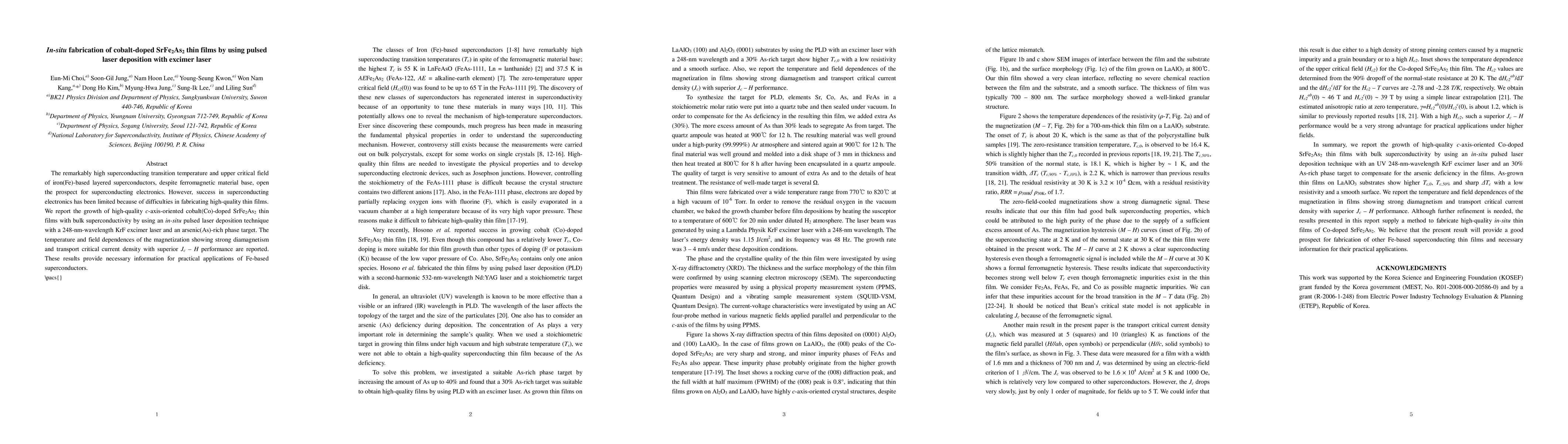 This paper reports the successful in-situ fabrication of high-quality, c-axis-oriented cobalt-doped SrFe2As2 thin films via pulsed laser deposition using a 248-nm excimer laser, achieving bulk superconductivity and superior Jc-H performance, which is crucial for advancing Fe-based superconductors in practical applications.
