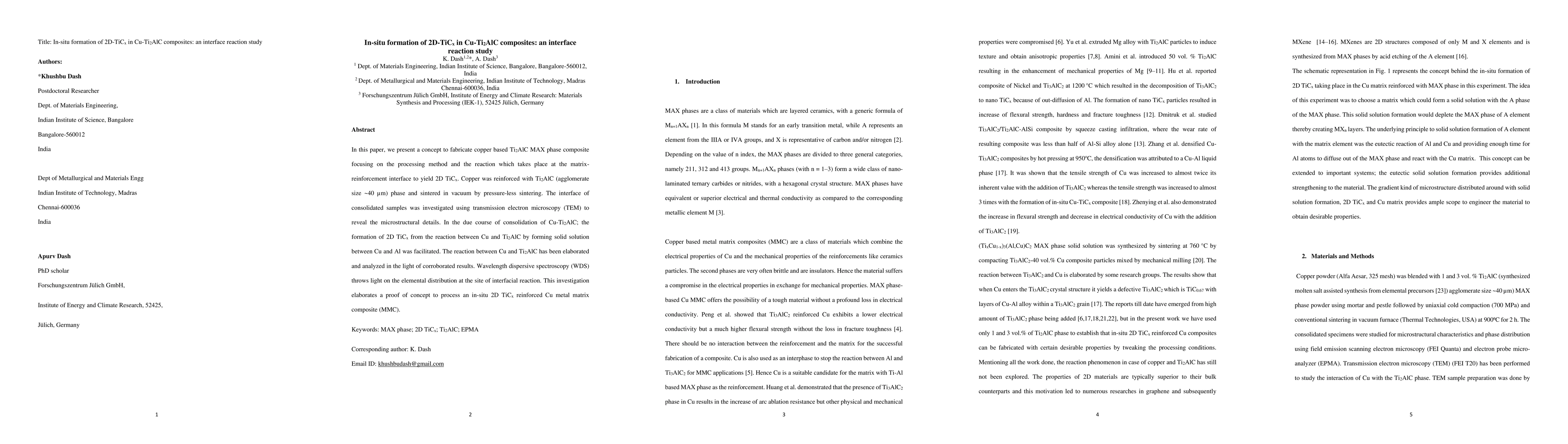 This study explores the fabrication of Cu-Ti2AlC composites via pressure-less sintering, revealing the formation of 2D TiCx at the interface through Cu-Ti2AlC reactions. TEM and WDS analyses provide insights into the microstructural details and elemental distribution, demonstrating a viable method for creating in-situ 2D TiCx reinforced Cu composites.