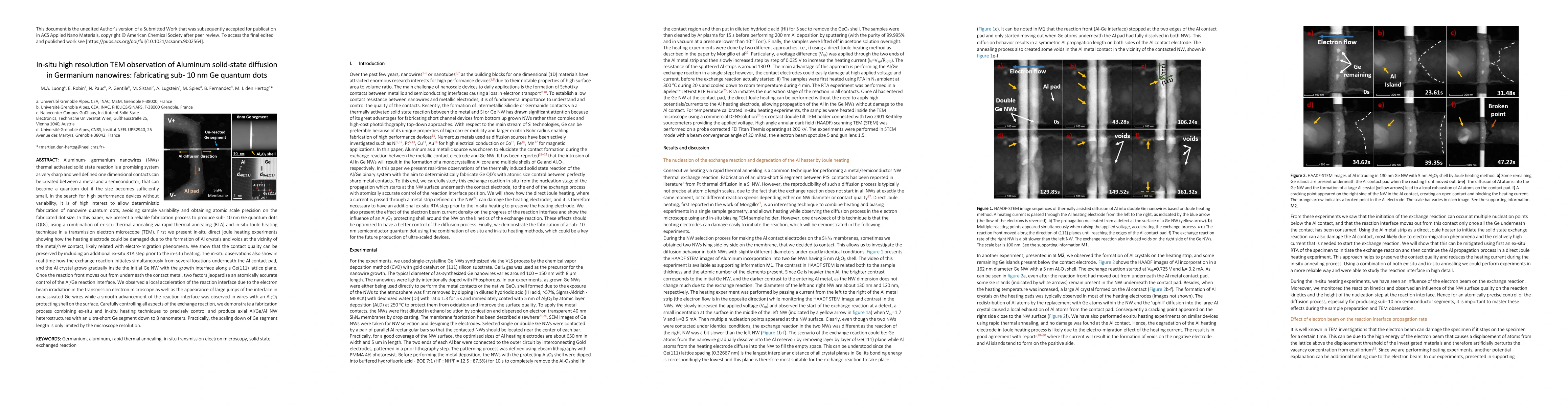 Aluminum-germanium nanowires (NWs) thermal activated solid state reaction is a promising system as very sharp and well defined one dimensional contacts can be created between a metal and a semiconductor, that can become a quantum dot if the size becomes sufficiently small. In the search for high performance devices without variability, it is of high interest to allow deterministic fabrication of nanowire quantum dots, avoiding sample variability and obtaining atomic scale precision on the fabricated dot size. In this paper, we present a reliable fabrication process to produce sub-10 nm Ge quantum dots (QDs), using a combination of ex-situ thermal annealing via rapid thermal annealing (RTA) and in-situ Joule heating technique in a transmission electron microscope (TEM). First we present in-situ direct joule heating experiments showing how the heating electrode could be damaged due to the formation of Al crystals and voids at the vicinity of the metal/NW contact, likely related with electro-migration phenomena. We show that the contact quality can be preserved by including an additional ex-situ RTA step prior to the in-situ heating. The in-situ observations also show in real-time how the exchange reaction initiates simultaneously from several locations underneath the Al contact pad, and the Al crystal grows gradually inside the initial Ge NW with the growth interface along a Ge(111) lattice plane. Once the reaction front moves out from underneath the contact metal, two factors jeopardize an atomically accurate control of the Al/Ge reaction interface. We observed a local acceleration of the reaction interface due to the electron beam irradiation in the transmission electron microscope as well as the appearance of large jumps of the interface in unpassivated Ge wires while a smooth advancement of the reaction interface was observed in wires with an Al2O3 protecting shell on the surface. Carefully controlling all aspects of the exchange reaction, we demonstrate a fabrication process combining ex-situ and in-situ heating techniques to precisely control and produce axial Al/Ge/Al NW heterostructures with an ultra-short Ge segment down to 8 nanometers. Practically, the scaling down of Ge segment length is only limited by the microscope resolution.