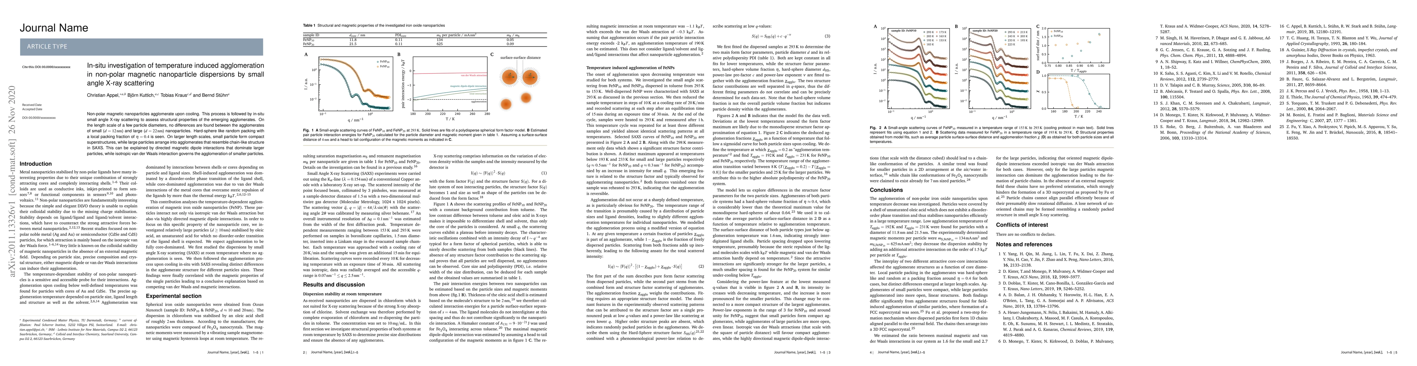 Non-polar magnetic nanoparticles agglomerate upon cooling. This process is followed by in-situ small angle X-ray scattering to assess structural properties of the emerging agglomerates. On the length scale of a few particle diameters, no differences are found between the agglomerates of small (d = 12nm) and large (d = 22nm) nanoparticles. Hard-sphere like random packing with a local packing fraction of $\eta$ = 0.4 is seen. On larger length scales, small particle form compact superstructures, while large particles arrange into agglomerates that resemble chain-like structure in SAXS. This can be explained by directed magnetic dipole interactions that dominate larger particles, while isotropic van der Waals interaction governs the agglomeration of smaller particles.