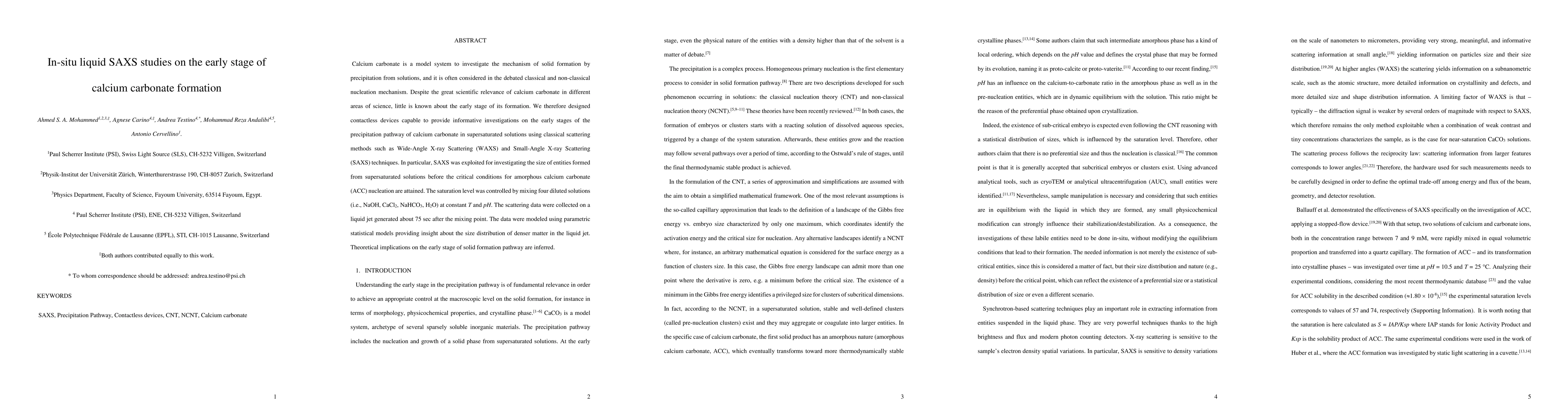 This paper investigates the early stages of calcium carbonate formation using in-situ liquid Small-Angle X-ray Scattering (SAXS) to study the size distribution of entities before amorphous calcium carbonate (ACC) nucleation. The study provides insights into the classical nucleation mechanism through controlled supersaturation and scattering data modeling.