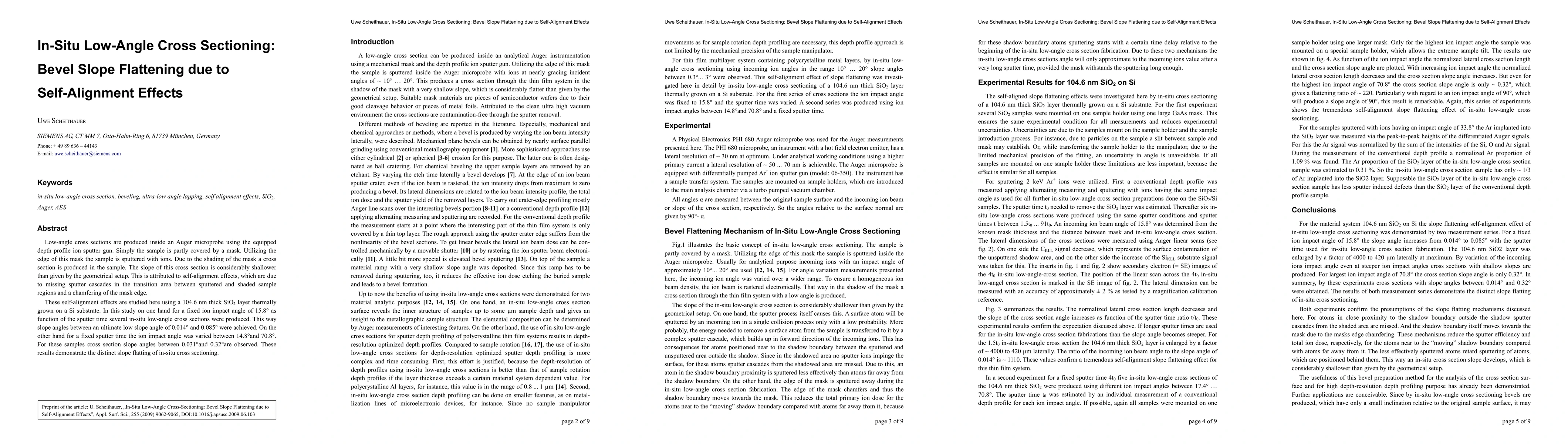 Low-angle cross sections are produced inside an Auger microprobe using the equipped depth profile ion sputter gun. Simply the sample is partly covered by a mask. Utilizing the edge of this mask the sample is sputtered with ions. Due to the shading of the mask a cross section is produced in the sample. The slope of this cross section is considerably shallower than given by the geometrical setup. This is attributed to self-alignment effects, which are due to missing sputter cascades in the transition area between sputtered and shaded sample regions and a chamfering of the mask edge. These self-alignment effects are studied here using a 104.6 nm thick SiO2 layer thermally grown on a Si substrate. In this study on one hand for a fixed ion impact angle of 15.8{\deg} as function of the sputter time several in-situ low-angle cross sections were produced. This way slope angles between an ultimate low slope angle of 0.014{\deg} and 0.085{\deg} were achieved. On the other hand for a fixed sputter time the ion impact angle was varied between 14.8{\deg}and 70.8{\deg}. For these samples cross section slope angles between 0.031{\deg}and 0.32{\deg}are observed. These results demonstrate the distinct slope flatting of in-situ cross sectioning.