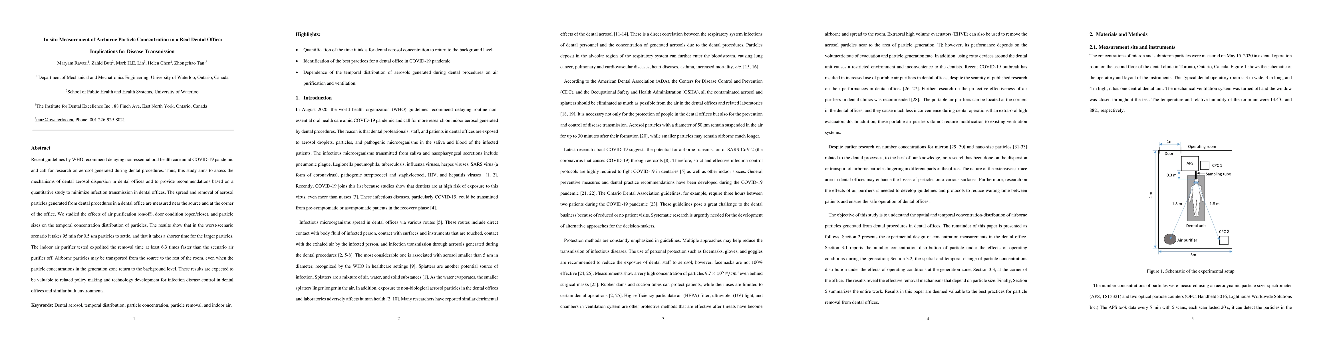 This study measures airborne particle concentration in a real dental office, finding that without air purification, 0.5µm particles take 95 minutes to settle. An indoor air purifier reduces this time significantly. The findings suggest strategies to minimize infection transmission in dental offices.