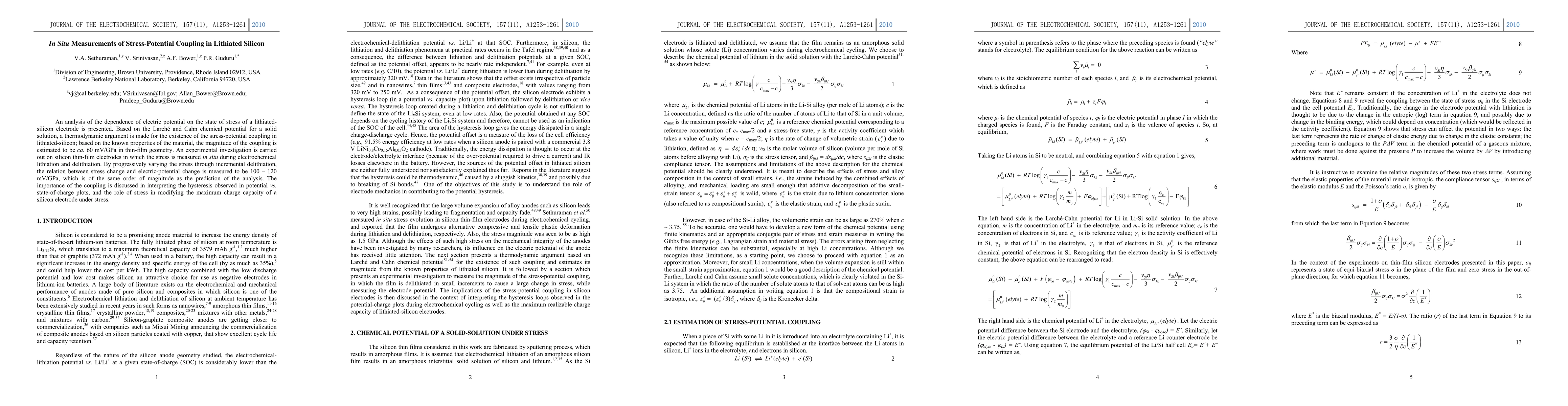 This paper investigates the stress-potential coupling in lithiated silicon using thermodynamic analysis and in situ measurements, finding a coupling magnitude of 100-120 mV/GPa, which aligns with theoretical predictions and highlights its significance in understanding hysteresis and charge capacity in silicon electrodes.