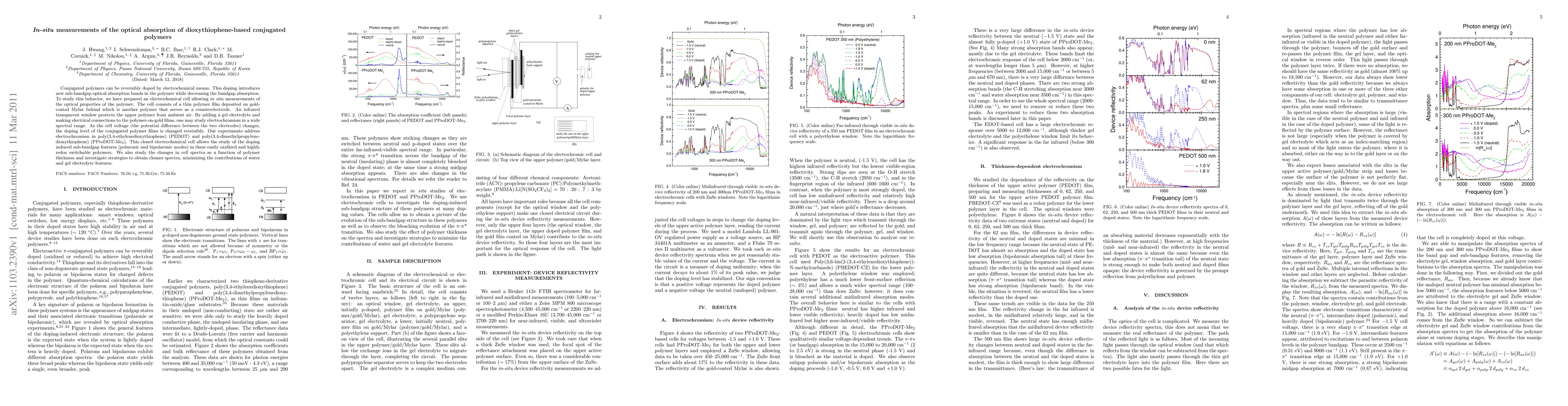 Conjugated polymers can be reversibly doped by electrochemical means. This doping introduces new sub-bandgap optical absorption bands in the polymer while decreasing the bandgap absorption. To study this behavior, we have prepared an electrochemical cell allowing measurements of the optical properties of the polymer. The cell consists of a thin polymer film deposited on gold-coated Mylar behind which is another polymer that serves as a counterelectrode. An infrared transparent window protects the upper polymer from ambient air. By adding a gel electrolyte and making electrical connections to the polymer-on-gold films, one may study electrochromism in a wide spectral range. As the cell voltage (the potential difference between the two electrodes) changes, the doping level of the conjugated polymer films is changed reversibly. Our experiments address electrochromism in poly(3,4-ethylene-dioxy-thiophene) (PEDOT) and poly(3,4-dimethyl-propylene-dioxy-thiophene) (PProDOT-Me$_2$). This closed electrochemical cell allows the study of the doping induced sub-bandgap features (polaronic and bipolaronic modes) in these easily oxidized and highly redox switchable polymers. We also study the changes in cell spectra as a function of polymer thickness and investigate strategies to obtain cleaner spectra, minimizing the contributions of water and gel electrolyte features.