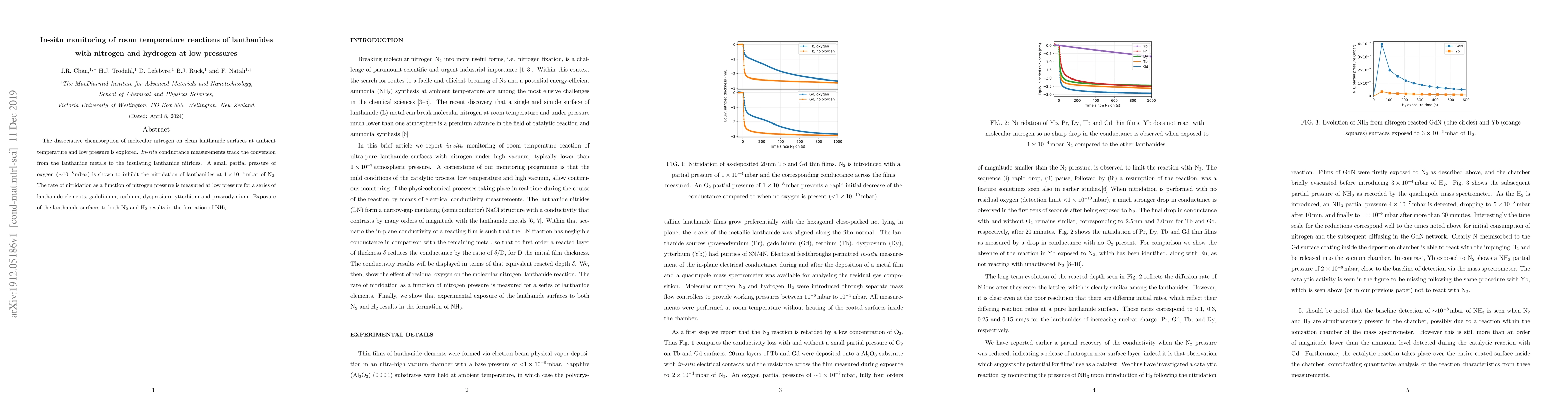 Researchers studied how lanthanide metals react with nitrogen and hydrogen at low pressures, finding that adding oxygen inhibits nitridation and both N2 and H2 form ammonia when exposed to the metals.