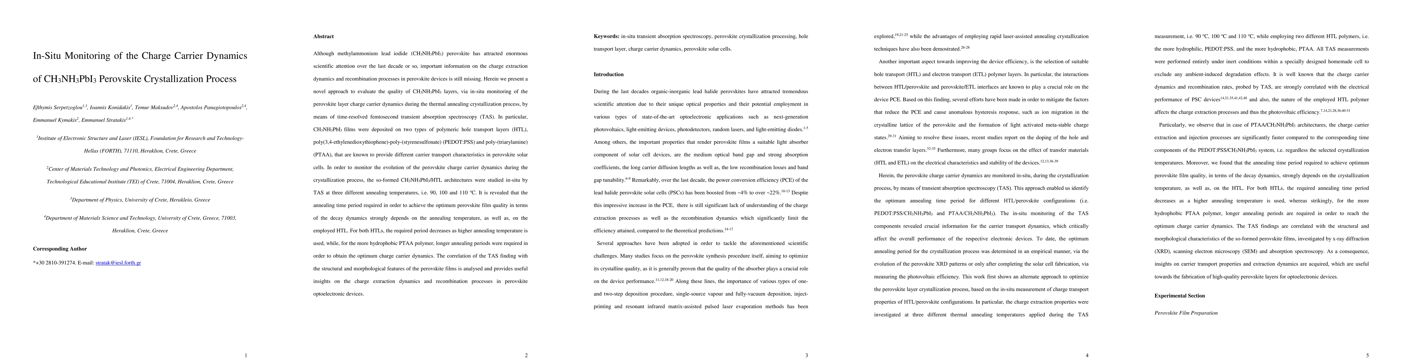 Although methylammonium lead iodide (CH$_3$NH$_3$PbI$_3$) perovskite has attracted enormous scientific attention over the last decade or so, important information on the charge extraction dynamics and recombination processes in perovskite devices is still missing. Herein we present a novel approach to evaluate the quality of CH$_3$NH$_3$PbI$_3$ layers, via in-situ monitoring of the perovskite layer charge carrier dynamics during the thermal annealing crystallization process, by means of time-resolved femtosecond transient absorption spectroscopy (TAS). In particular, CH$_3$NH$_3$PbI$_3$ films were deposited on two types of polymeric hole transport layers (HTL), poly(3,4-ethylenedioxythiophene)-poly-(styrenesulfonate) (PEDOT:PSS) and poly-(triarylamine) (PTAA), that are known to provide different carrier transport characteristics in perovskite solar cells. In order to monitor the evolution of the perovskite charge carrier dynamics during the crystallization process, the so-formed CH$_3$NH$_3$PbI$_3$/HTL architectures were studied in-situ by TAS at three different annealing temperatures, i.e. 90, 100 and 110 oC. It is revealed that the annealing time period required in order to achieve the optimum perovskite film quality in terms of the decay dynamics strongly depends on the annealing temperature, as well as, on the employed HTL. For both HTLs, the required period decreases as higher annealing temperature is used, while, for the more hydrophobic PTAA polymer, longer annealing periods were required in order to obtain the optimum charge carrier dynamics. The correlation of the TAS finding with the structural and morphological features of the perovskite films is analysed and provides useful insights on the charge extraction dynamics and recombination processes in perovskite optoelectronic devices.