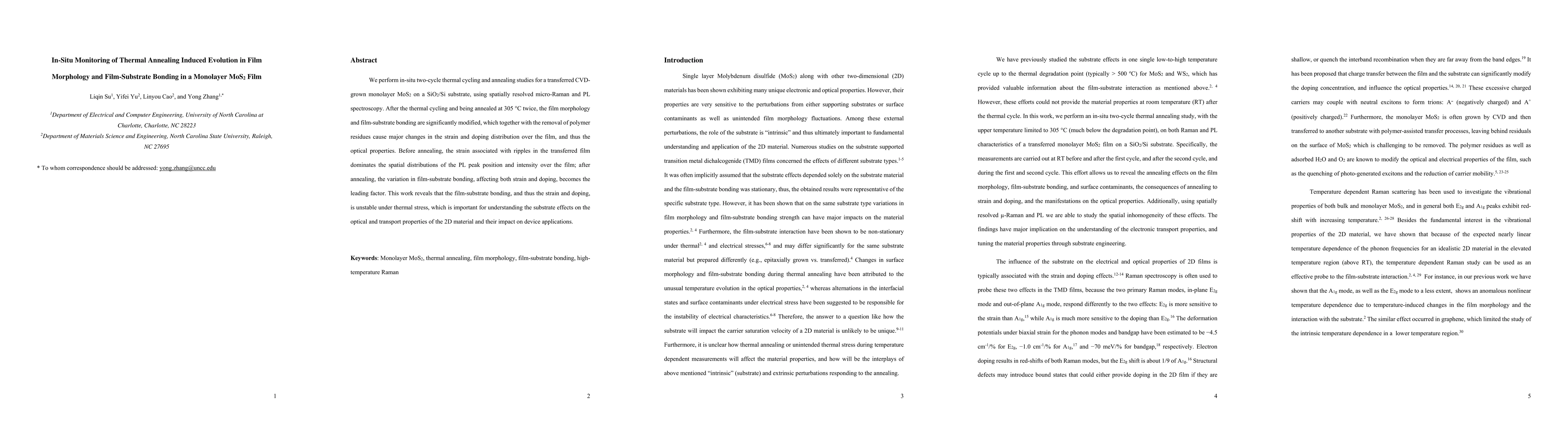 This study investigates the evolution of a monolayer MoS2 film's morphology and film-substrate bonding through in-situ thermal annealing using micro-Raman and PL spectroscopy. The thermal cycling and annealing at 305°C twice significantly alter the film's strain, doping, and optical properties, highlighting the instability of film-substrate bonding under thermal stress.
