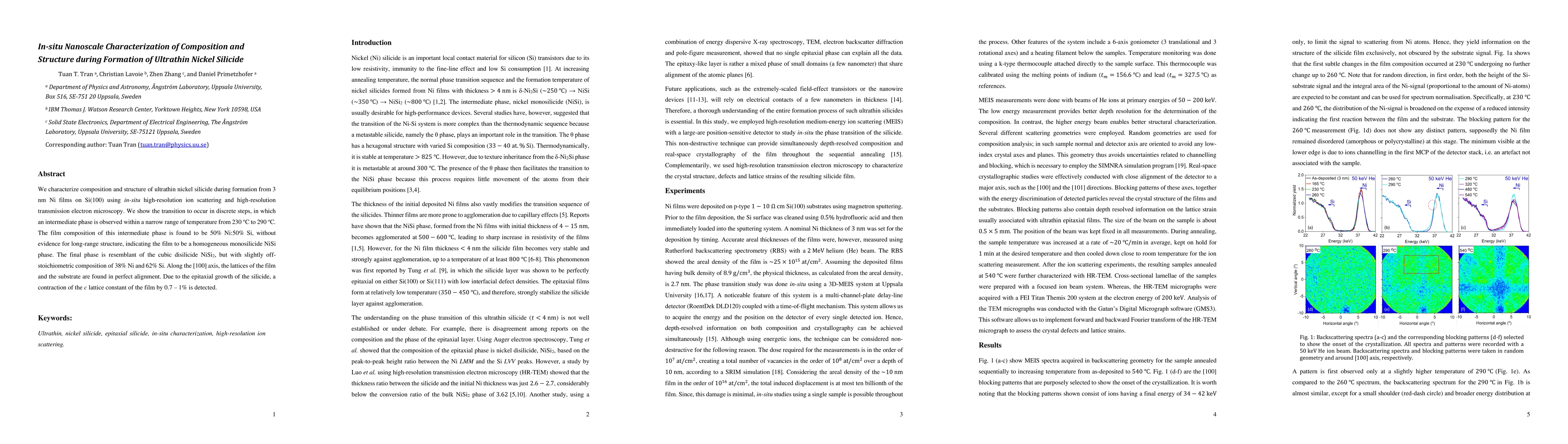This research utilizes in-situ high resolution techniques to study the formation of ultrathin nickel silicide, revealing a transition through an intermediate NiSi phase to a final off-stoichiometric NiSi2 phase with perfect epitaxial alignment and a slight contraction in lattice constant.