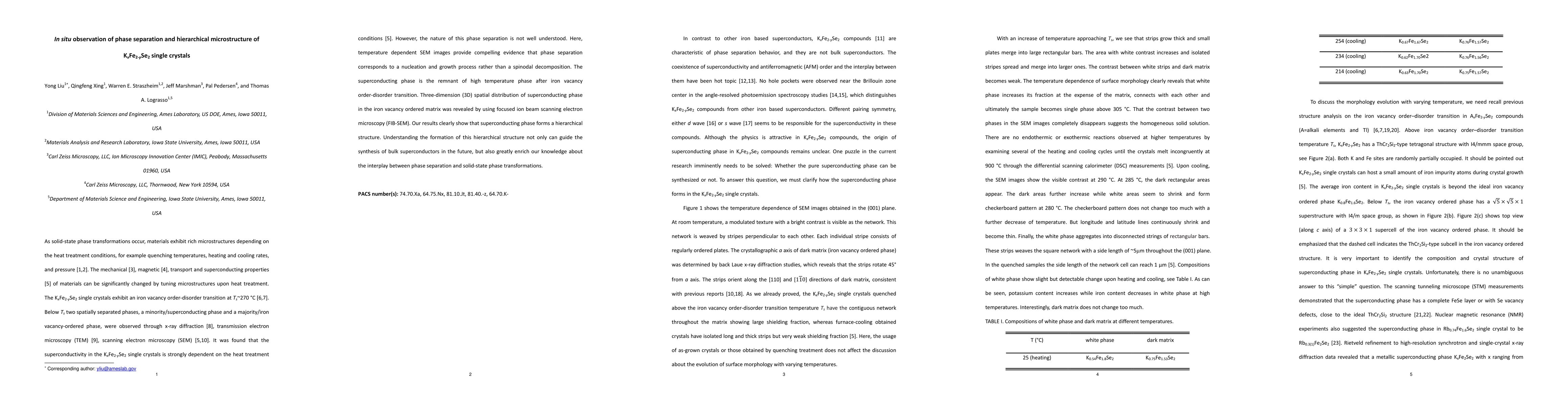 This study reveals that phase separation in KxFe2-ySe2 single crystals follows a nucleation and growth process rather than spinodal decomposition, with the superconducting phase emerging post iron vacancy order-disorder transition. The hierarchical microstructure of the superconducting phase is elucidated using FIB-SEM, providing insights into the synthesis of bulk superconductors and the relationship between phase separation and solid-state transformations.