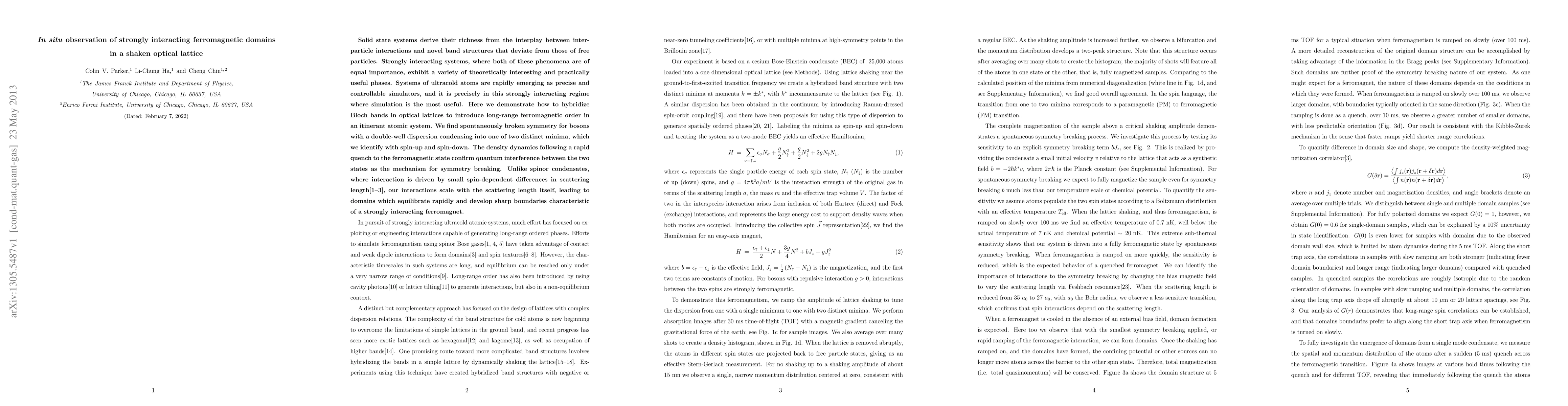 Solid state systems derive their richness from the interplay between interparticle interactions and novel band structures that deviate from those of free particles. Strongly interacting systems, where both of these phenomena are of equal importance, exhibit a variety of theoretically interesting and practically useful phases. Systems of ultracold atoms are rapidly emerging as precise and controllable simulators, and it is precisely in this strongly interacting regime where simulation is the most useful. Here we demonstrate how to hybridize Bloch bands in optical lattices to introduce long-range ferromagnetic order in an itinerant atomic system. We find spontaneously broken symmetry for bosons with a double-well dispersion condensing into one of two distinct minima, which we identify with spin-up and spin-down. The density dynamics following a rapid quench to the ferromagnetic state confirm quantum interference between the two states as the mechanism for symmetry breaking. Unlike spinor condensates, where interaction is driven by small spin-dependent differences in scattering length, our interactions scale with the scattering length itself, leading to domains which equilibrate rapidly and develop sharp boundaries characteristic of a strongly interacting ferromagnet.