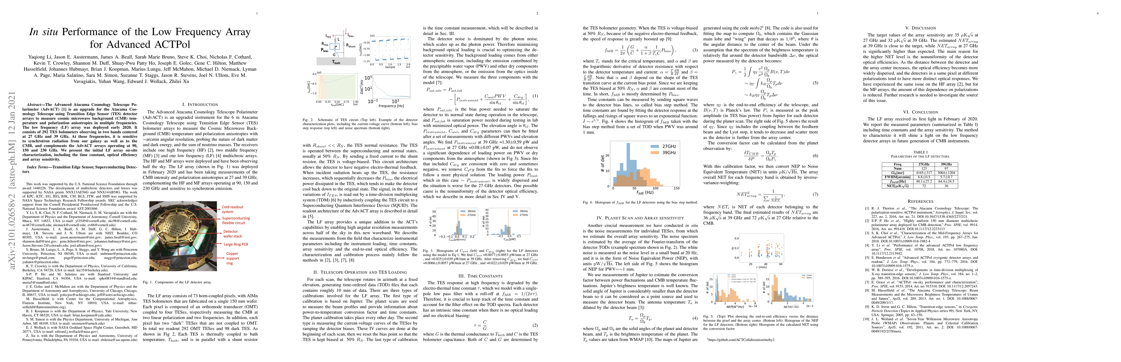 The Advanced Atacama Cosmology Telescope Polarimeter (AdvACT) \cite{thornton} is an upgrade for the Atacama Cosmology Telescope using Transition Edge Sensor (TES) detector arrays to measure cosmic microwave background (CMB) temperature and polarization anisotropies in multiple frequencies. The low frequency (LF) array was deployed early 2020. It consists of 292 TES bolometers observing in two bands centered at 27 GHz and 39 GHz. At these frequencies, it is sensitive to synchrotron radiation from our galaxy as well as to the CMB, and complements the AdvACT arrays operating at 90, 150 and 230 GHz. We present the initial LF array on-site characterization, including the time constant, optical efficiency and array sensitivity.