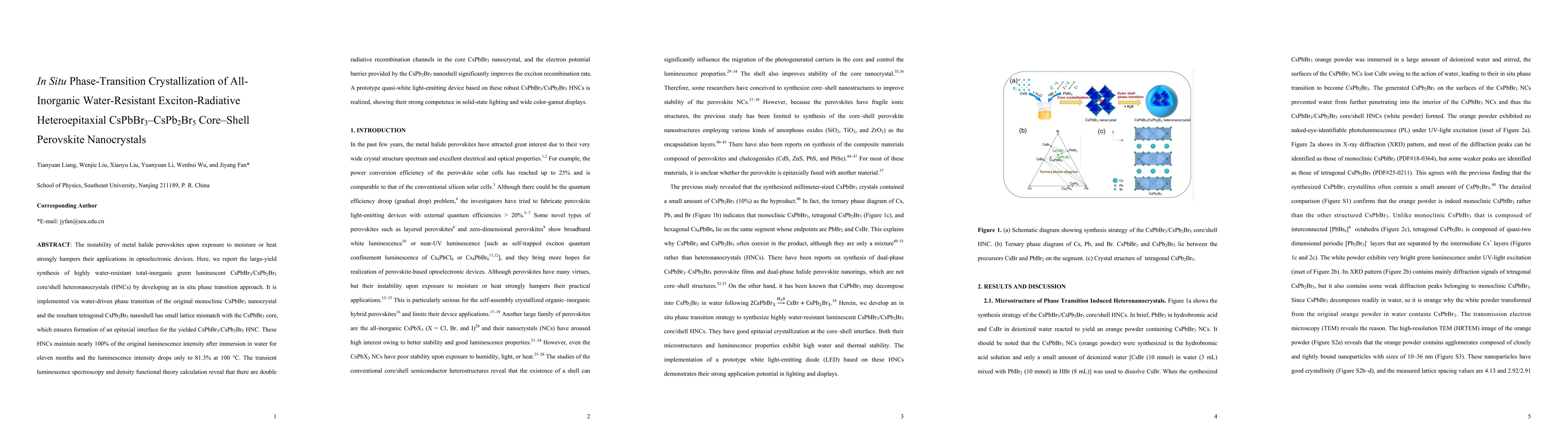 The instability of metal halide perovskites upon exposure to moisture or heat strongly hampers their applications in optoelectronic devices. Here, we report the large-yield synthesis of highly water-resistant total-inorganic green luminescent CsPbBr3/CsPb2Br5 core/shell heteronanocrystals (HNCs) by developing an in situ phase transition approach. It is implemented via water-driven phase transition of the original monoclinic CsPbBr3 nanocrystal and the resultant tetragonal CsPb2Br5 nanoshell has small lattice mismatch with the CsPbBr3 core, which ensures formation of an epitaxial interface for the yielded CsPbBr3/CsPb2Br5 HNCs. These HNCs maintain nearly 100% of the original luminescence intensity after immersion in water for eleven months and the luminescence intensity drops only to 81.3% at 100 {\deg}C. The transient luminescence spectroscopy and density functional theory calculation reveal that there are double radiative recombination channels in the core CsPbBr3 nanocrystal, and the electron potential barrier provided by the CsPb2Br5 nanoshell significantly improves the exciton recombination rate. A prototype quasi-white light-emitting device based on these robust CsPbBr3/CsPb2Br5 HNCs is realized, showing their strong competence in solid-state lighting and wide color-gamut displays.