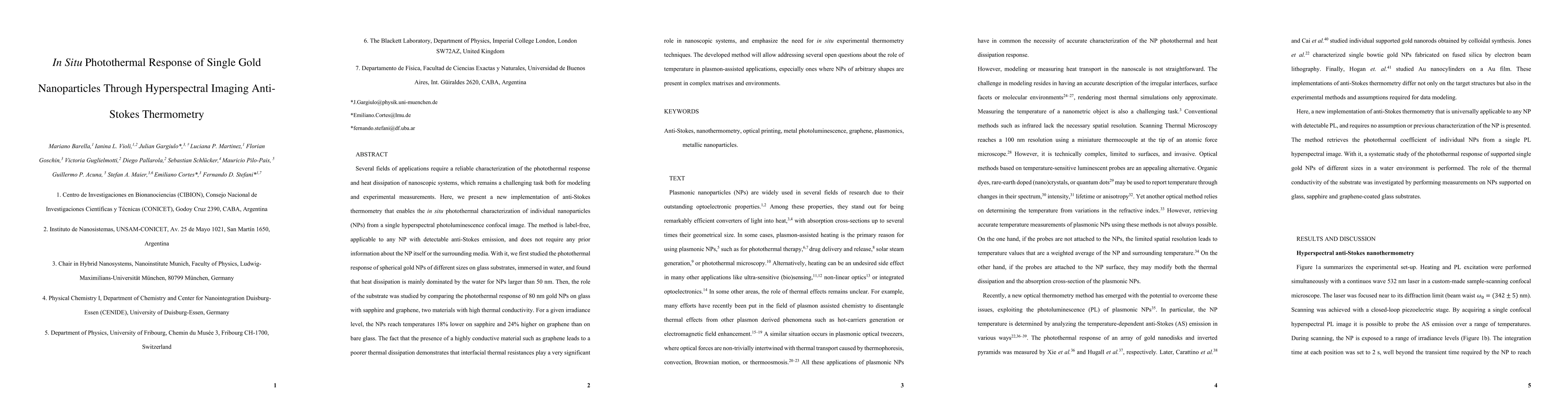 This paper introduces a novel anti-Stokes thermometry technique for in situ photothermal characterization of single gold nanoparticles using hyperspectral imaging. The method reveals that larger gold nanoparticles (over 50 nm) dissipate heat mainly through surrounding water, while substrates like sapphire and graphene significantly alter the nanoparticles' temperature due to differing thermal conductivities and interfacial resistances.