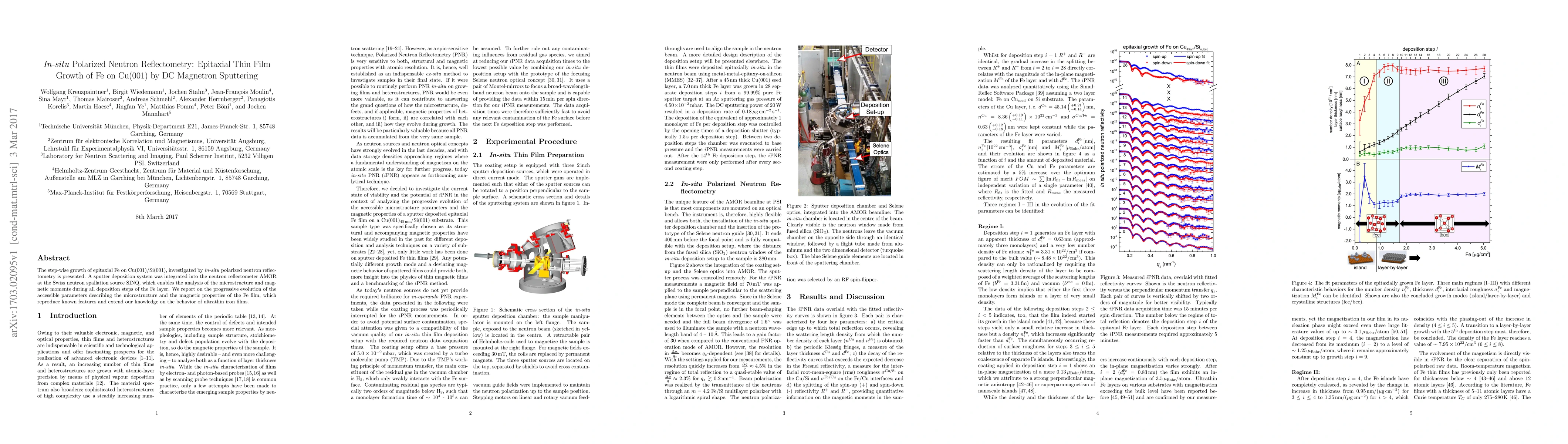 The step-wise growth of epitaxial Fe on Cu(001)/Si(001), investigated by in-situ polarized neutron reflectometry is presented. A sputter deposition system was integrated into the neutron reflectometer AMOR at the Swiss neutron spallation source SINQ, which enables the analysis of the microstructure and magnetic moments during all deposition steps of the Fe layer. We report on the progressive evolution of the accessible parameters describing the microstructure and the magnetic properties of the Fe film, which reproduce known features and extend our knowledge on the behavior of ultrathin iron films.