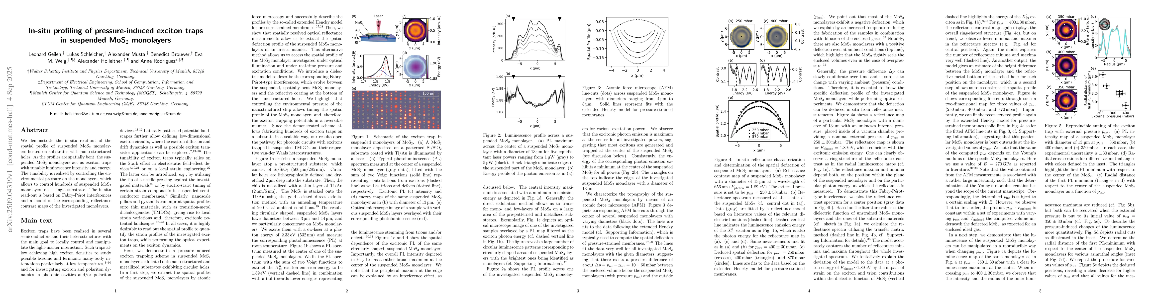 We demonstrate the in-situ read-out of the spatial profile of suspended MoS$_2$ monolayers hosted on substrates with nano-structured holes. As the profiles are spatially bent, the suspended MoS$_2$ monolayers act as exciton traps with tunable luminescence intensity and energy. The tunability is realized by controlling the environmental pressure on the monolayers, which allows to control hundreds of suspended MoS$_2$ monolayers on a single substrate. The in-situ read-out is based on Fabry-P\'erot interferences and a model of the corresponding reflectance contrast maps of the investigated monolayers.