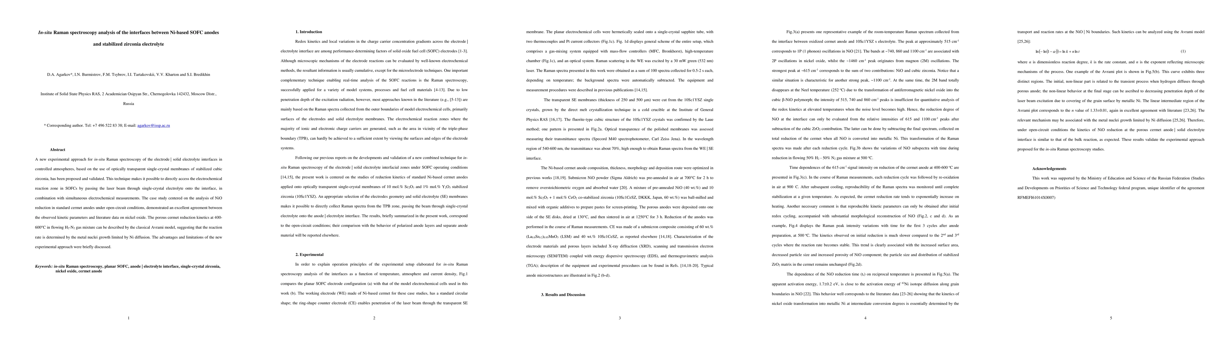 This paper proposes and validates an in-situ Raman spectroscopy method using transparent single-crystal membranes of stabilized zirconia to analyze the interfaces in solid oxide fuel cells (SOFCs). The technique allows direct observation of the electrochemical reaction zone, demonstrating good agreement with literature on NiO reduction kinetics.
