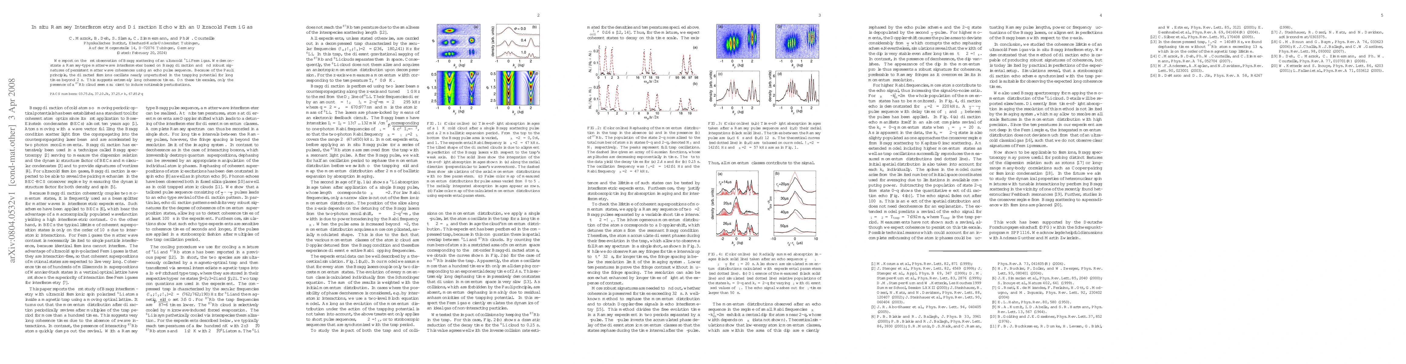 This paper reports the first observation of Bragg scattering in an ultracold $^6$Li Fermi gas and demonstrates a Ramsey-type interferometer based on Bragg diffraction, revealing long coherence times due to the Pauli principle. The study also finds persistent matter wave coherences using an echo pulse sequence, suggesting minimal perturbations from a nearby $^{87}$Rb cloud.
