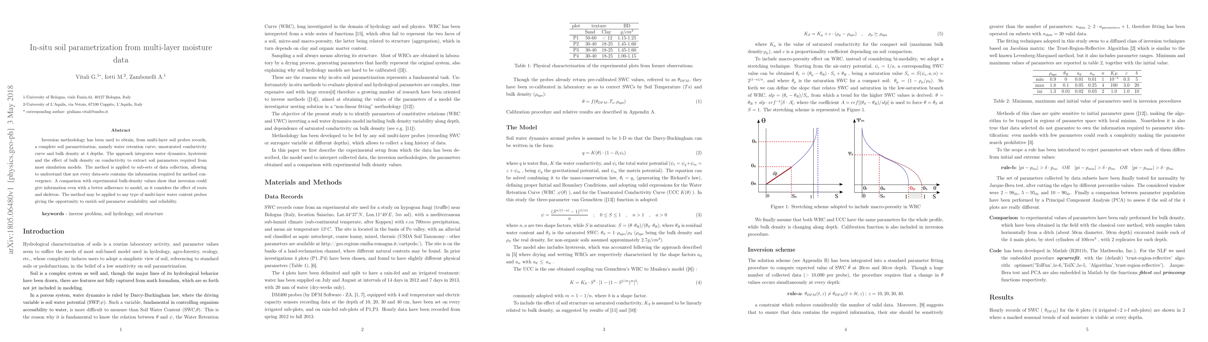 Inversion methodology has been used to obtain, from multi-layer soil probes records, a complete soil parametrisation, namely water retention curve, unsaturated conductivity curve and bulk density at 4 depths. The approach integrates water dynamics, hysteresis and the effect of bulk density on conductivity to extract soil parameters required from most simulation models. The method is applied to sub-sets of data collection, allowing to understand that not every data-sets contains the information required for method convergence. A comparison with experimental bulk-density values show that inversion could give information even with a better adherence to model, as it considers the effect of roots and skeleton. The method may be applied to any type of multi-layer water content probes giving the opportunity to enrich soil parameter availability and reliability.