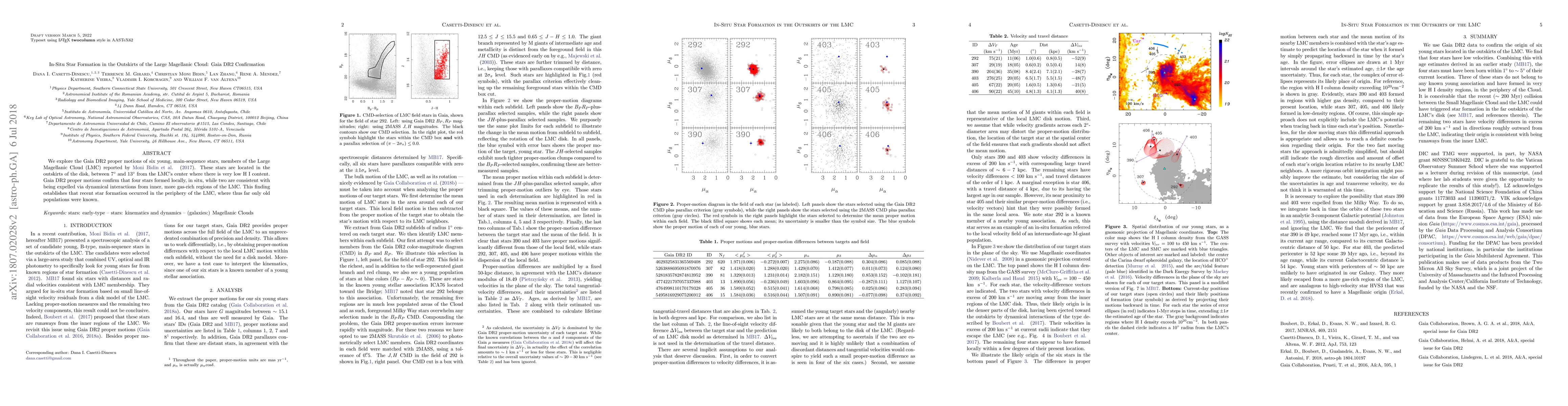 Summary: Gaia DR2 proper motions confirm in-situ star formation in the outskirts of the Large Magellanic Cloud, revealing recent star formation in regions previously thought to host only old populations. Two stars suggest they were expelled from gas-rich inner regions.