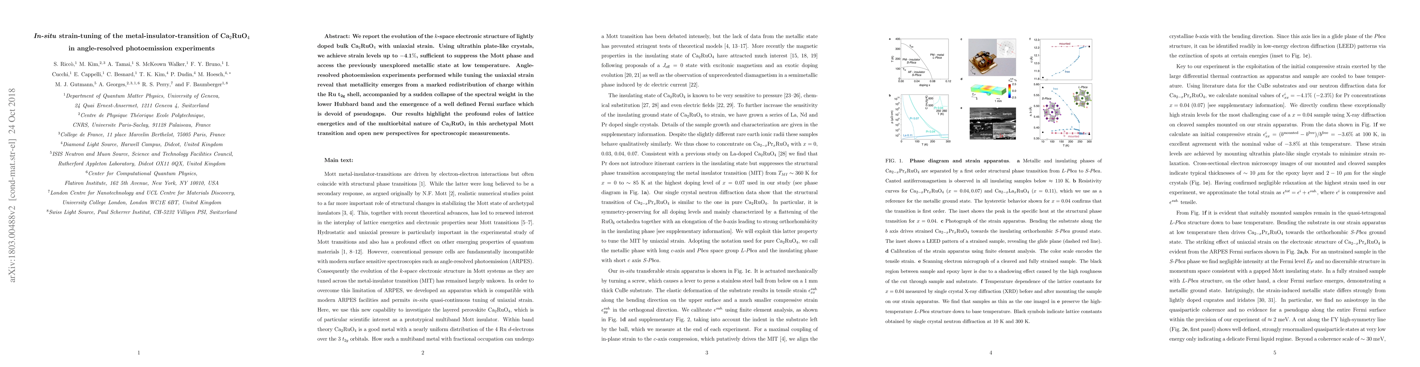 We report the evolution of the $k$-space electronic structure of lightly doped bulk Ca$_{2}$RuO$_{4}$ with uniaxial strain. Using ultrathin plate-like crystals, we achieve strain levels up to $-4.1\%$, sufficient to suppress the Mott phase and access the previously unexplored metallic state at low temperature. Angle-resolved photoemission experiments performed while tuning the uniaxial strain reveal that metallicity emerges from a marked redistribution of charge within the Ru $t_{2g}$ shell, accompanied by a sudden collapse of the spectral weight in the lower Hubbard band and the emergence of a well defined Fermi surface which is devoid of pseudogaps. Our results highlight the profound roles of lattice energetics and of the multiorbital nature of Ca$_{2}$RuO$_{4}$ in this archetypal Mott transition and open new perspectives for spectroscopic measurements.