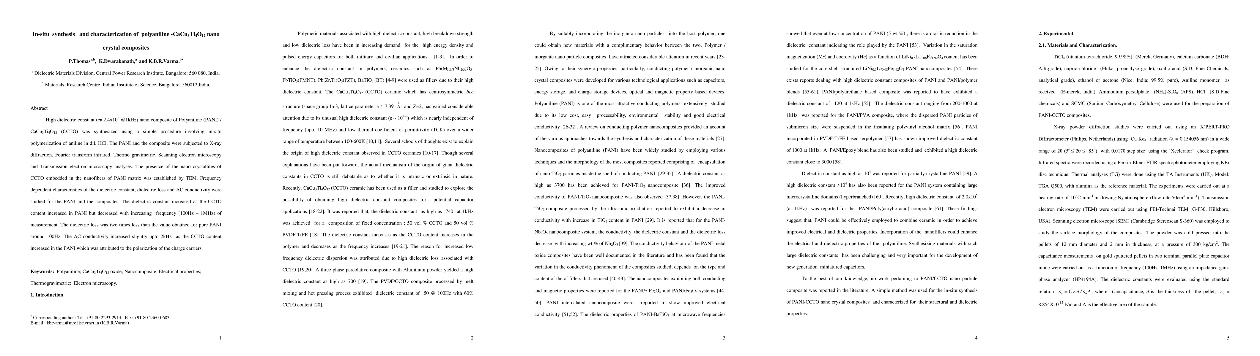 High dielectric constant nano composite of Polyaniline (PANI) CaCu3Ti4O12 (CCTO) was synthesized using a simple procedure involving in-situ polymerization of aniline in dil. HCl. The PANI and the composite were subjected to X-ray diffraction, Fourier transform infrared, Thermo gravimetric, Scanning electron microscopy and Transmission electron microscopy analyses. The presence of the nano crystallites of CCTO embedded in the nanofibers of PANI matrix was established by TEM. Frequency dependent characteristics of the dielectric constant, dielectric loss and AC conductivity were studied for the PANI and the composites. The dielectric constant increased as the CCTO content increased in PANI but decreased with increasing frequency of measurement. The dielectric loss was two times less than the value obtained for pure PANI around 100Hz. The AC conductivity increased slightly upto 2kHz as the CCTO content increased in the PANI which was attributed to the polarization of the charge carriers.