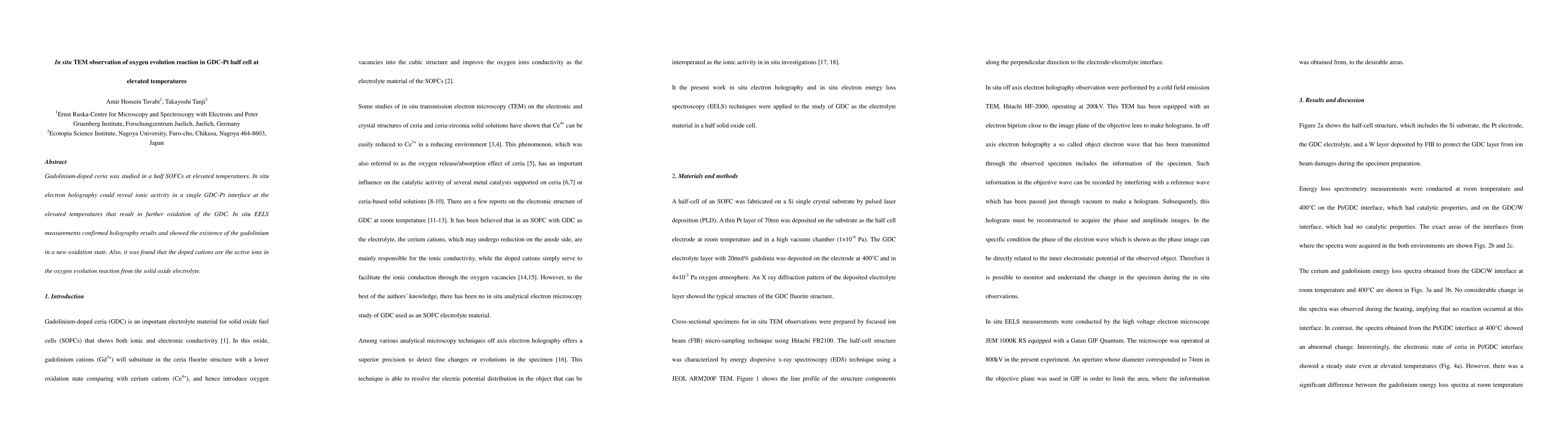 Gadolinium-doped ceria was studied in a half SOFCs at elevated temperatures. In situ electron holography could reveal ionic activity in a single GDC-Pt interface at the elevated temperatures that result in further oxidation of the GDC. In situ EELS measurements confirmed holography results and showed the existence of the gadolinium in a new oxidation state. Also, it was found that the doped cations are the active ions in the oxygen evolution reaction from the solid oxide electrolyte.