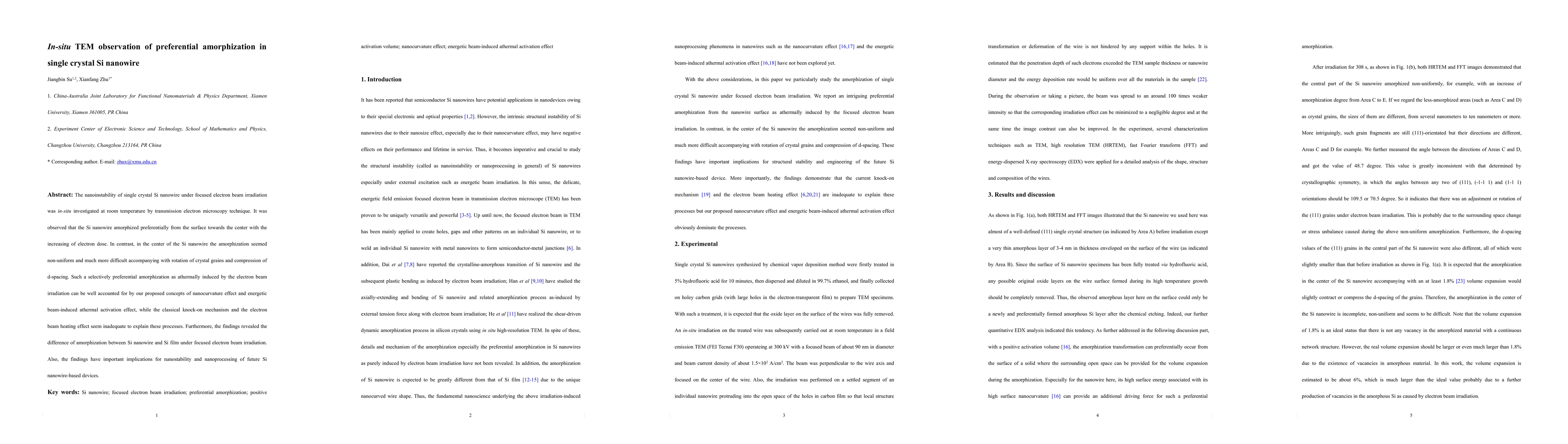 This paper investigates the preferential amorphization of single crystal Si nanowires under focused electron beam irradiation via in-situ TEM, revealing amorphization from the surface inward. The study proposes nanocurvature and energetic beam-induced athermal activation effects to explain the observed phenomena, contrasting with classical mechanisms.