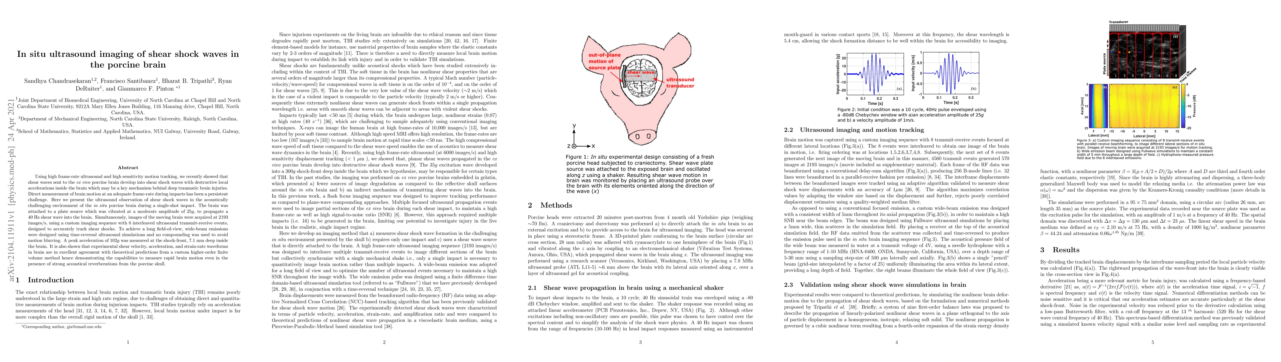 This study uses high frame-rate ultrasound to observe shear shock waves in the in situ porcine brain, revealing peak accelerations of 102g deep inside the brain, which may be a key mechanism behind traumatic brain injuries. The custom imaging sequence and time-reversal ultrasound simulations enabled accurate tracking of these rapid motions despite strong acoustic reverberations.