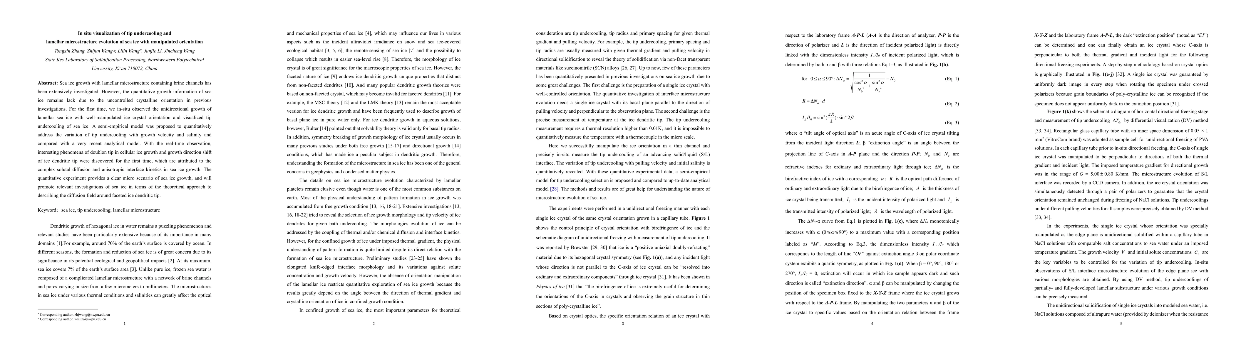 This study in-situ visualizes the growth of unidirectional lamellar sea ice with controlled crystal orientation, revealing tip undercooling and microstructure evolution. A semi-empirical model was developed to quantify these factors, discovering new phenomena like doublon tip formation and growth direction shifts due to anisotropic kinetics.