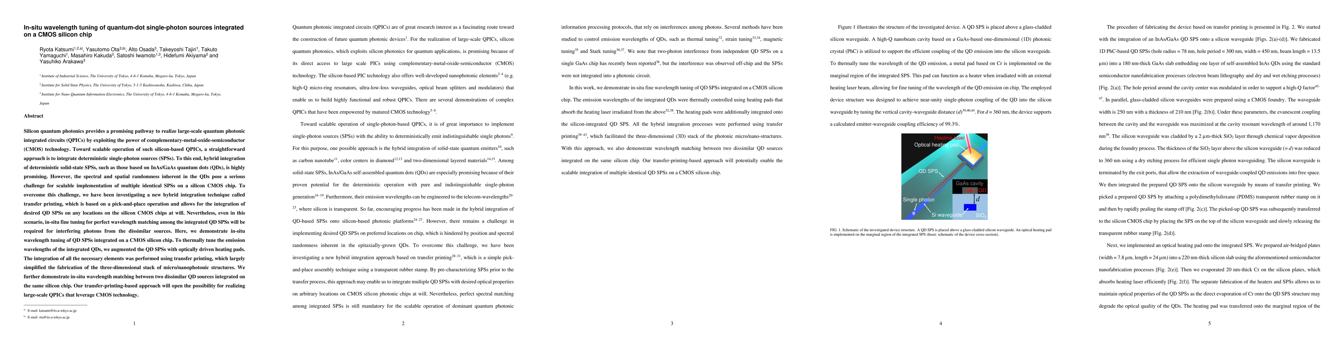 This research demonstrates a novel hybrid integration technique using transfer printing to integrate quantum-dot single-photon sources on CMOS silicon chips, achieving in-situ wavelength tuning via optically driven heating pads for precise matching, paving the way for scalable quantum photonic integrated circuits.