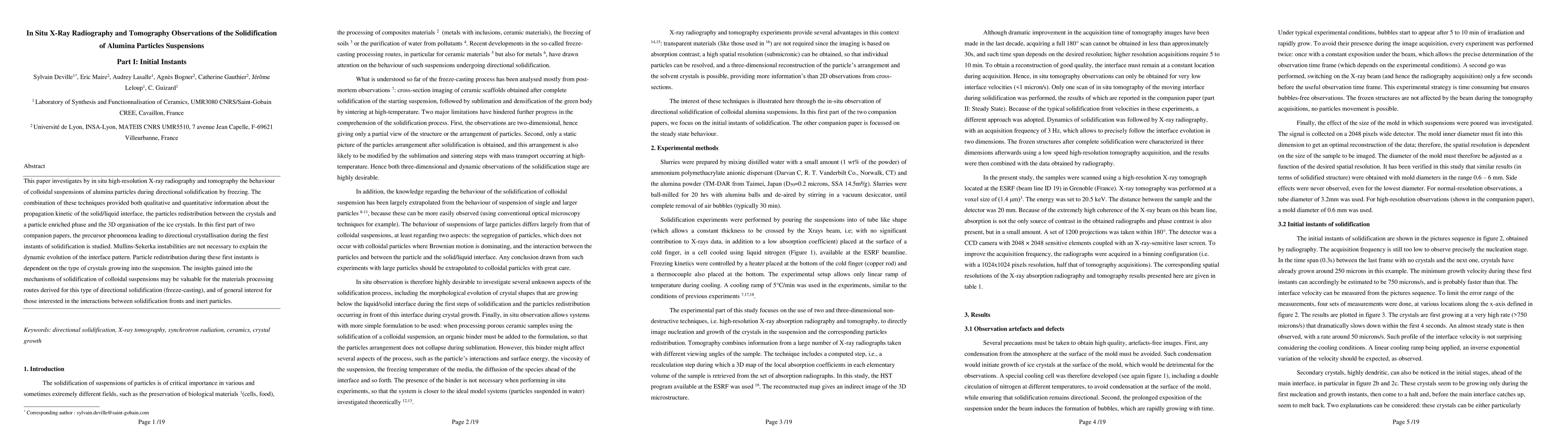 This paper uses in situ high-resolution X-ray radiography and tomography to study the initial solidification behavior of alumina particle suspensions, revealing the dynamic evolution of the solid/liquid interface and particle redistribution without reliance on Mullins-Sekerka instabilities. The findings provide valuable insights into the mechanisms of directional solidification in colloidal suspensions.