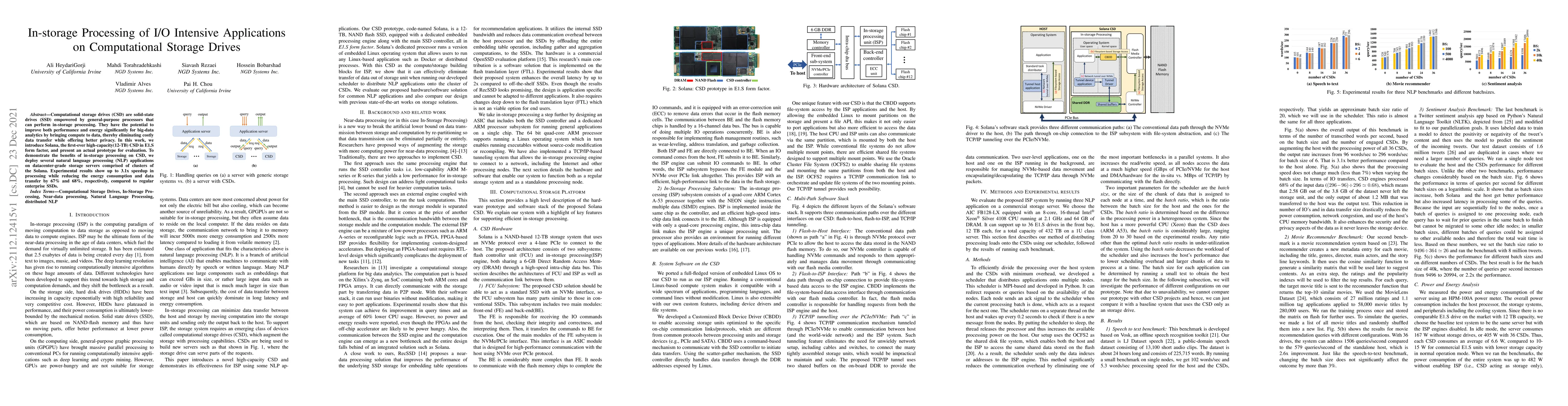 Computational storage drives (CSD) are solid-state drives (SSD) empowered by general-purpose processors that can perform in-storage processing. They have the potential to improve both performance and energy significantly for big-data analytics by bringing compute to data, thereby eliminating costly data transfer while offering better privacy. In this work, we introduce Solana, the first-ever high-capacity(12-TB) CSD in E1.S form factor, and present an actual prototype for evaluation. To demonstrate the benefits of in-storage processing on CSD, we deploy several natural language processing (NLP) applications on datacenter-grade storage servers comprised of clusters of the Solana. Experimental results show up to 3.1x speedup in processing while reducing the energy consumption and data transfer by 67% and 68%, respectively, compared to regular enterprise SSDs.