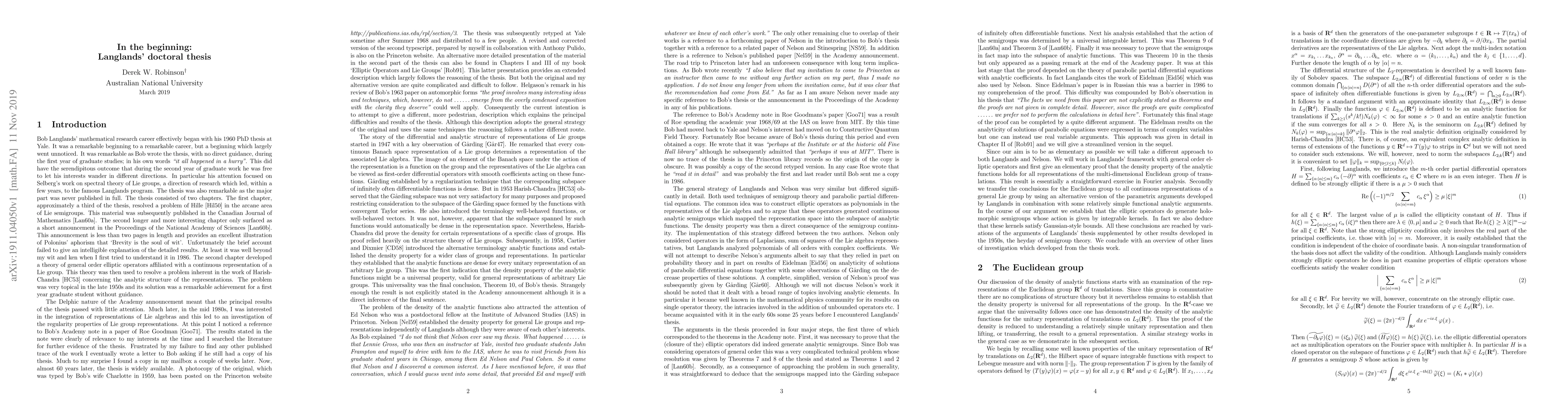 This is a draft version of an invited article for a forthcoming book `The genesis of Langlands Program', eds. Julia Mueller and Freydoon Shahidi, which will be published in the London Mathematics Society Lecture Notes Series. It gives a description of the background and content of the unpublished doctoral thesis of Robert Langlands with many alternative explanations and proofs of the principal results.